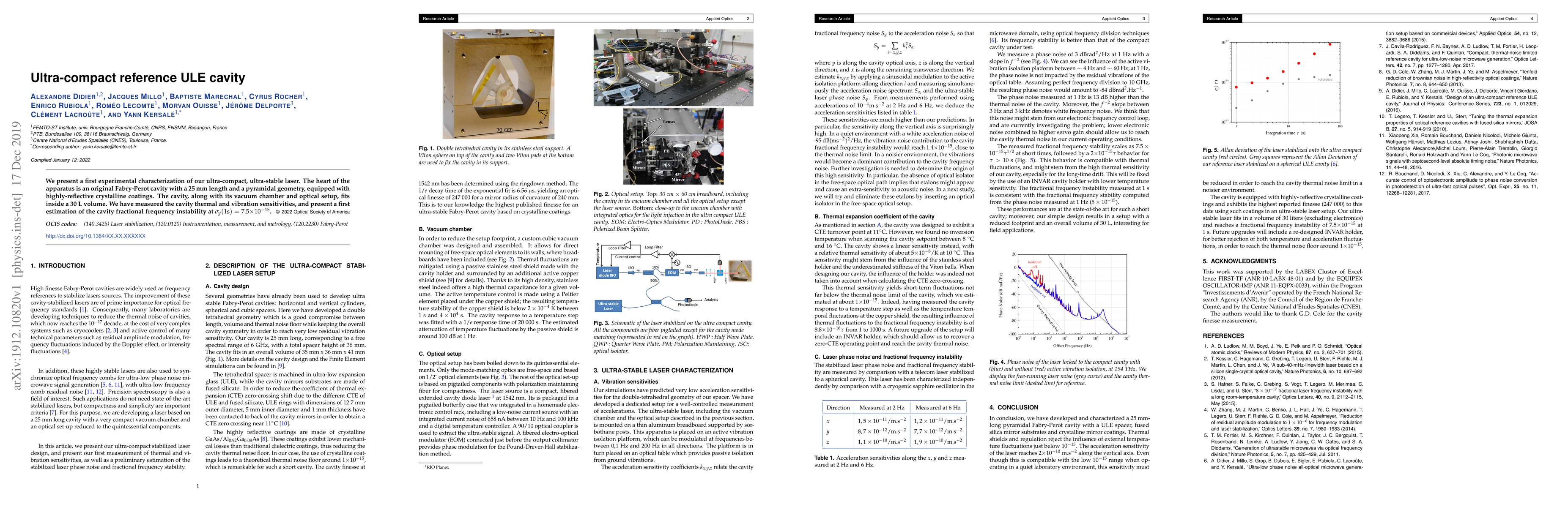 We present a first experimental characterization of our ultra-compact, ultra-stable laser. The heart of the apparatus is an original Fabry-Perot cavity with a 25 mm length and a pyramidal geometry, equipped with highly-reflective crystalline coatings. The cavity, along with its vacuum chamber and optical setup, fits inside a 30 L volume. We have measured the cavity thermal and vibration sensitivities, and present a first estimation of the cavity fractional frequency instability at $\sigma_y(1\rm{s})=7.5{\times}10^{-15}$.