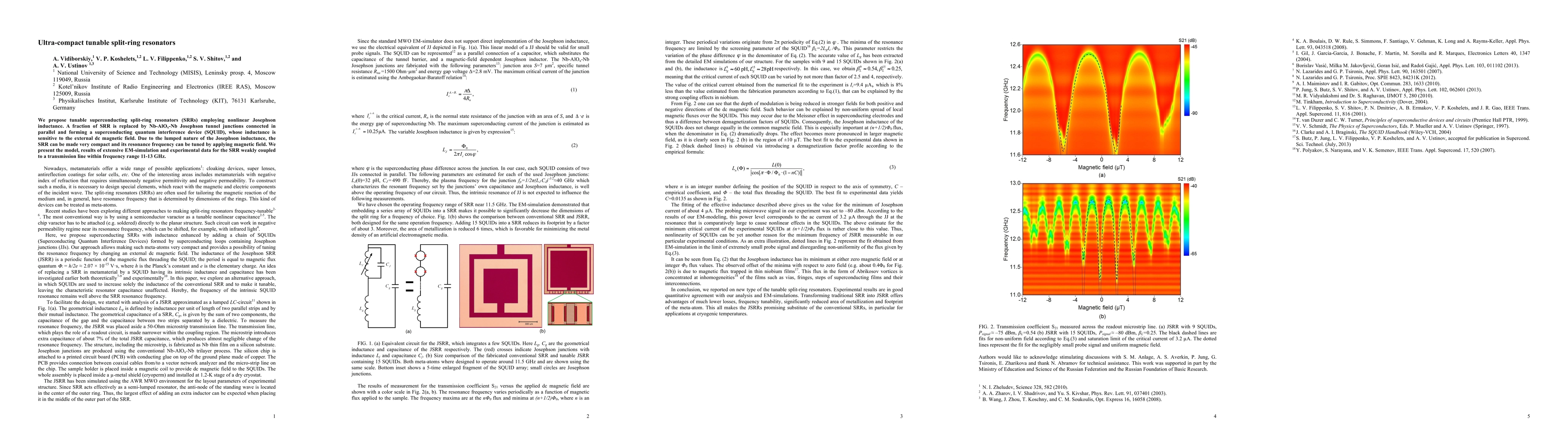 This paper proposes ultra-compact, tunable superconducting split-ring resonators using nonlinear Josephson inductance. The resonators, incorporating Nb-AlOx-Nb Josephson junctions, allow resonance frequency tuning via external magnetic fields, demonstrated through EM-simulation and experiments in the 11-13 GHz range.