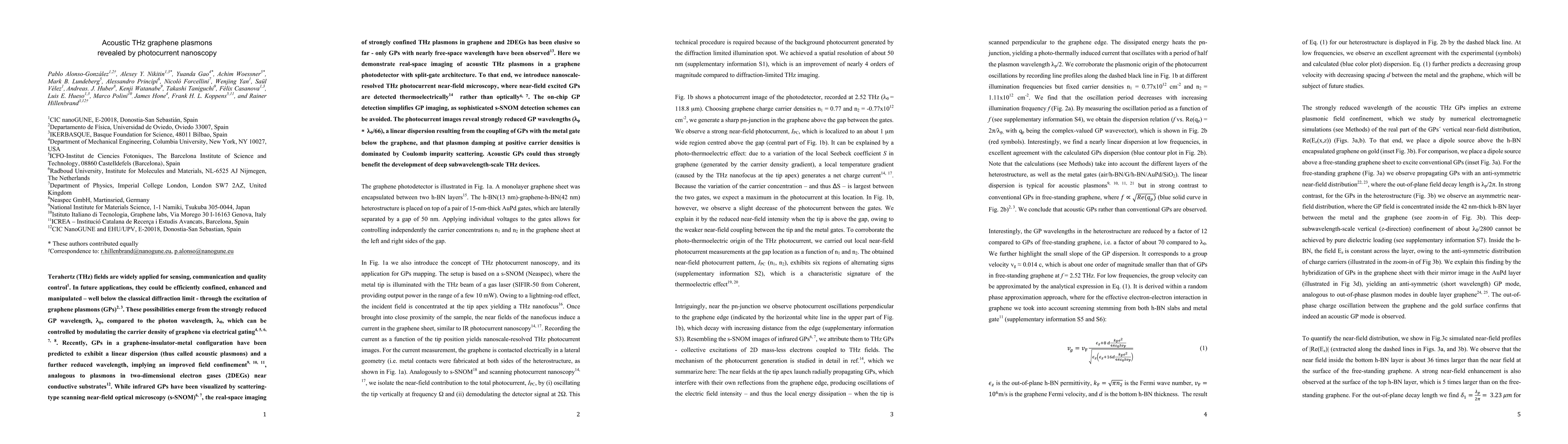 This research demonstrates real-space imaging of ultra-confined acoustic THz graphene plasmons using nanoscale THz photocurrent near-field microscopy. The study reveals reduced plasmon wavelengths and linear dispersion, suggesting improved field confinement for deep subwavelength-scale THz device applications.