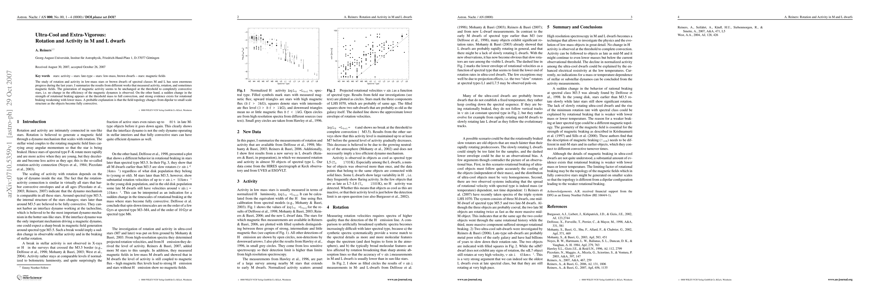 The study of rotation and activity in low-mass stars or brown dwarfs of spectral classes M and L has seen enormous progress during the last years. I summarize the results from different works that measured activity, rotation, and sometimes magnetic fields. The generation of magnetic activity seems to be unchanged at the threshold to completely convective stars, i.e. no change in the efficiency of the magnetic dynamos is observed. On the other hand, a sudden change in the strength of rotational braking appears at the threshold mass to full convection, and strong evidence exists for rotational braking weakening with lower mass. A probable explanation is that the field topology changes from dipolar to small scale structure as the objects become fully convective.