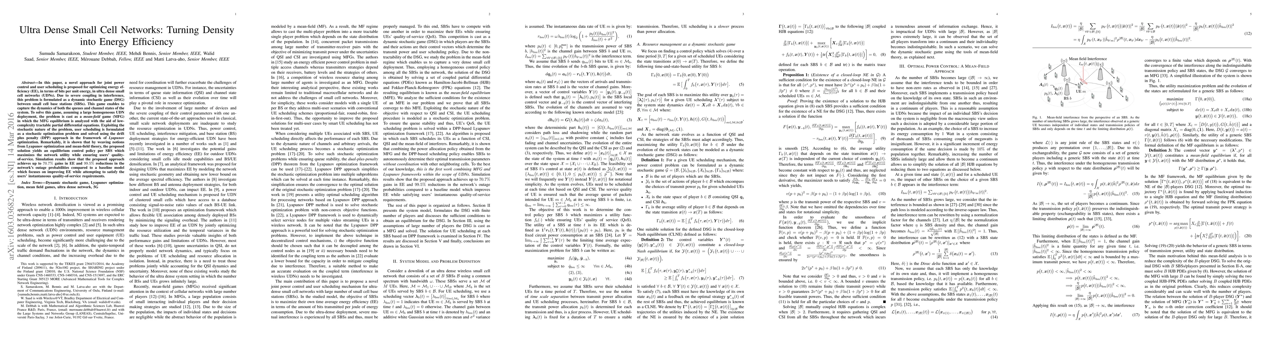 This paper proposes a novel joint power control and user scheduling method for ultra dense small cell networks, formulated as a dynamic stochastic game to optimize energy efficiency. The approach leverages mean-field theory and Lyapunov optimization to achieve significant gains in energy efficiency and reductions in outage probabilities.