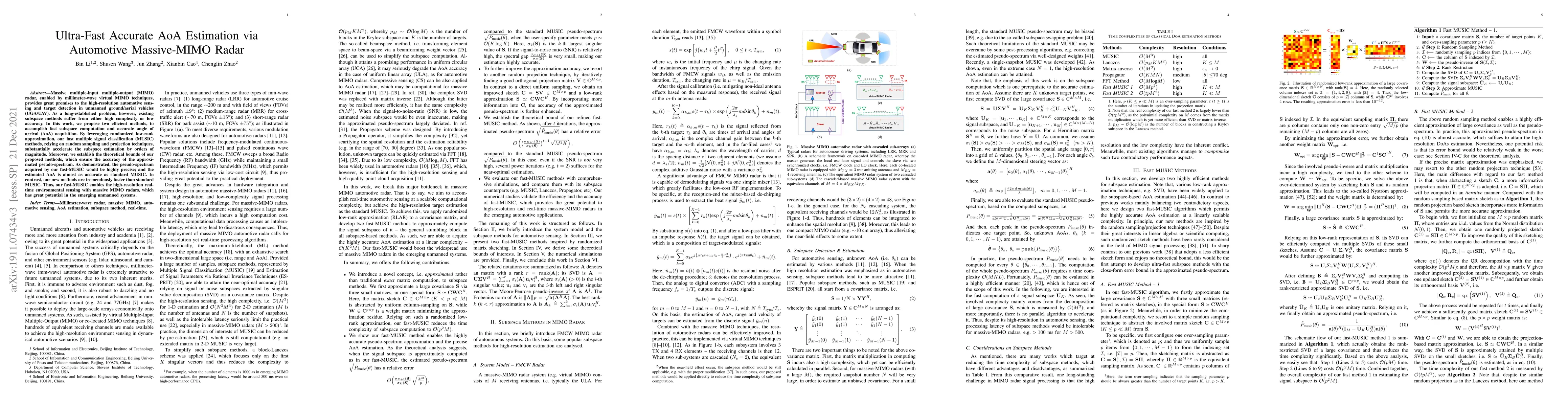 Massive multiple-input multiple-output (MIMO) radar, enabled by millimeter-wave virtual MIMO techniques, provides great promises to the high-resolution automotive sensing and target detection in unmanned ground/aerial vehicles (UGA/UAV). As a long-established problem, however, existing subspace methods suffer from either high complexity or low accuracy. In this work, we propose two efficient methods, to accomplish fast subspace computation and accurate angle of arrival (AoA) acquisition. By leveraging randomized low-rank approximation, our fast multiple signal classification (MUSIC) methods, relying on random sampling and projection techniques, substantially accelerate the subspace estimation by orders of magnitude. Moreover, we establish the theoretical bounds of our proposed methods, which ensure the accuracy of the approximated pseudo-spectrum. As demonstrated, the pseudo-spectrum acquired by our fast-MUSIC would be highly precise; and the estimated AoA is almost as accurate as standard MUSIC. In contrast, our new methods are tremendously faster than standard MUSIC. Thus, our fast-MUSIC enables the high-resolution real-time environmental sensing with massive MIMO radars, which has great potential in the emerging unmanned systems.