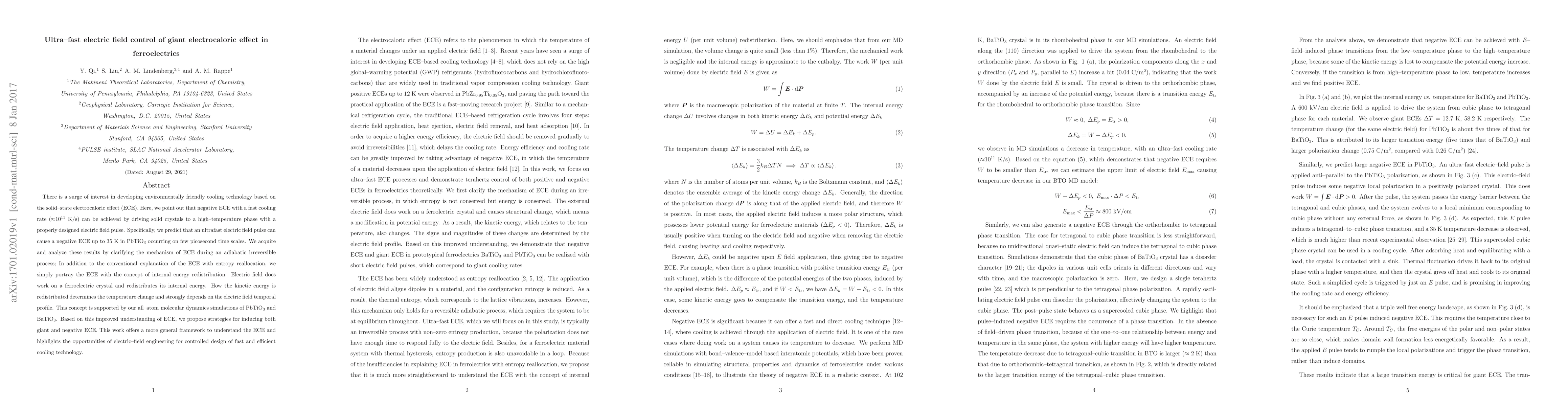 There is a surge of interest in developing environmentally friendly cooling technology based on the solid--state electrocaloric effect (ECE). Here, we point out that negative ECE with a fast cooling rate ($\approx$10$^{11}$ K/s) can be achieved by driving solid crystals to a high--temperature phase with a properly designed electric field pulse. Specifically, we predict that an ultrafast electric field pulse can cause a negative ECE up to 35 K in PbTiO$_3$ occurring on few picosecond time scales. We acquire and analyze these results by clarifying the mechanism of ECE during an adiabatic irreversible process; In addition to the conventional explanation of the ECE with entropy reallocation, we simply portray the ECE with the concept of internal energy redistribution. Electric field does work on a ferroelectric crystal and redistributes its internal energy. How the kinetic energy is redistributed determines the temperature change and strongly depends on the electric field temporal profile. This concept is supported by our all--atom molecular dynamics simulations of PbTiO$_3$ and BaTiO$_3$. Based on this improved understanding of ECE, we propose strategies for inducing both giant and negative ECE. This work offers a more general framework to understand the ECE and highlights the opportunities of electric--field engineering for controlled design of fast and efficient cooling technology.