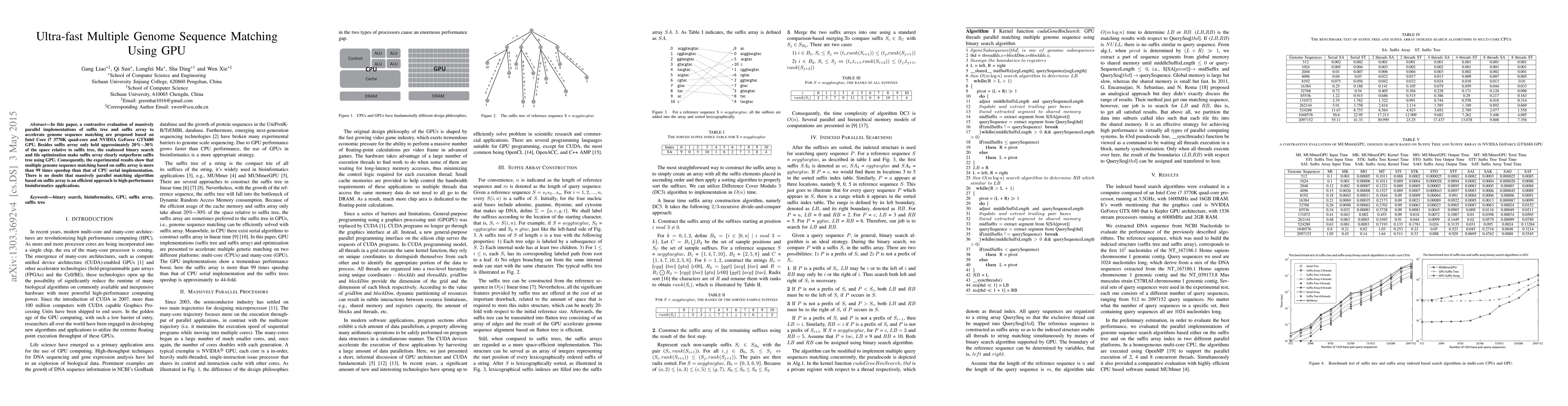 In this paper, a contrastive evaluation of massively parallel implementations of suffix tree and suffix array to accelerate genome sequence matching are proposed based on Intel Core i7 3770K quad-core and NVIDIA GeForce GTX680 GPU. Besides suffix array only held approximately 20%~30% of the space relative to suffix tree, the coalesced binary search and tile optimization make suffix array clearly outperform suffix tree using GPU. Consequently, the experimental results show that multiple genome sequence matching based on suffix array is more than 99 times speedup than that of CPU serial implementation. There is no doubt that massively parallel matching algorithm based on suffix array is an efficient approach to high-performance bioinformatics applications.