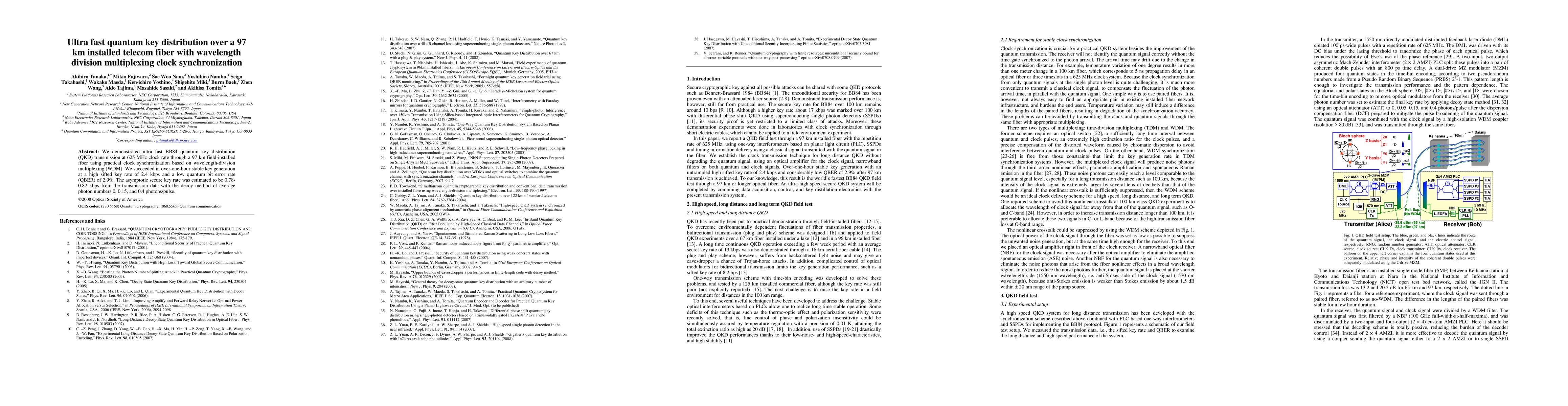 This paper demonstrates ultra-fast quantum key distribution (QKD) over a 97 km telecom fiber at a 625 MHz clock rate using wavelength-division multiplexing for clock synchronization. The researchers achieved stable key generation for over one hour with a sifted key rate of 2.4 kbps and a low quantum bit error rate of 2.9%.
