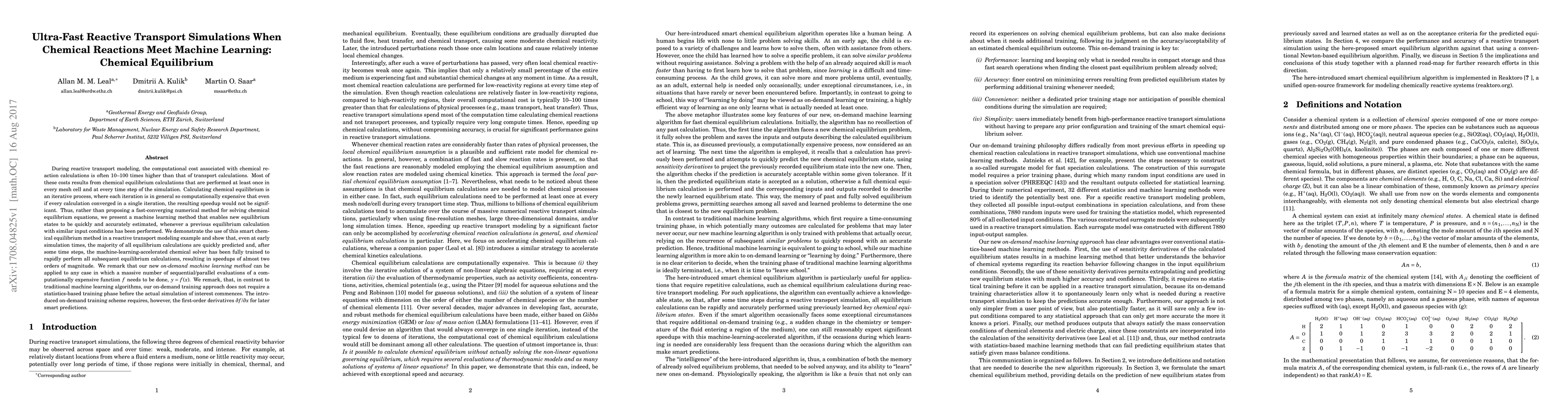 This paper proposes a machine learning method to accelerate chemical equilibrium calculations in reactive transport simulations, achieving speedups of almost two orders of magnitude. The method uses on-demand training to quickly estimate new equilibrium states based on previous calculations, eliminating the need for a traditional training phase.