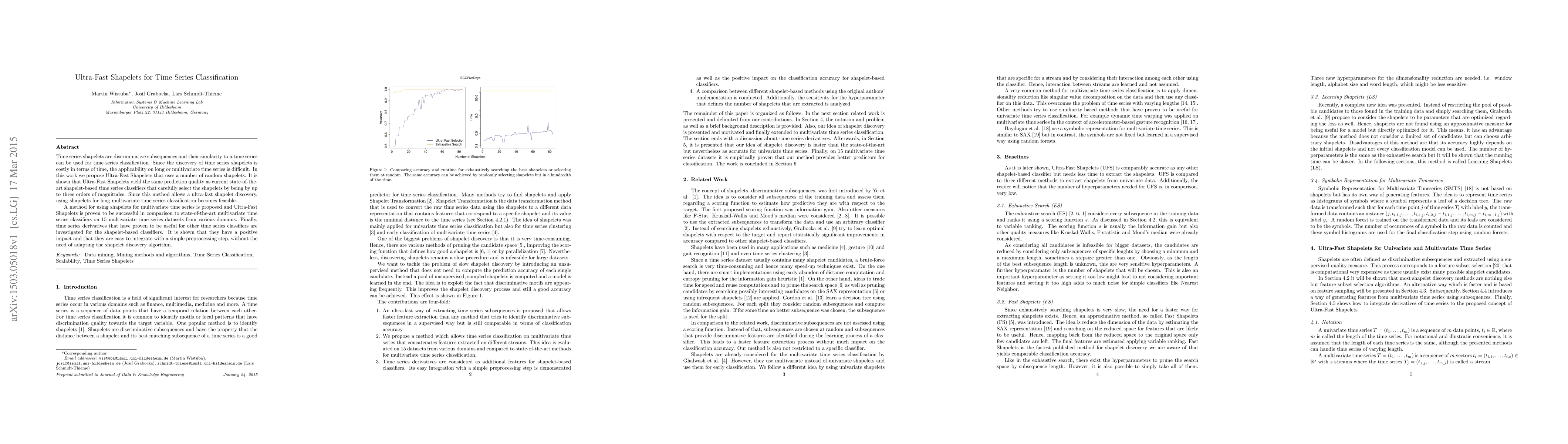 This paper introduces Ultra-Fast Shapelets, a method that employs random shapelets to drastically reduce the time required for shapelet discovery, achieving comparable classification accuracy to state-of-the-art methods. The approach enables effective classification of long and multivariate time series, validated through experiments on 15 datasets.