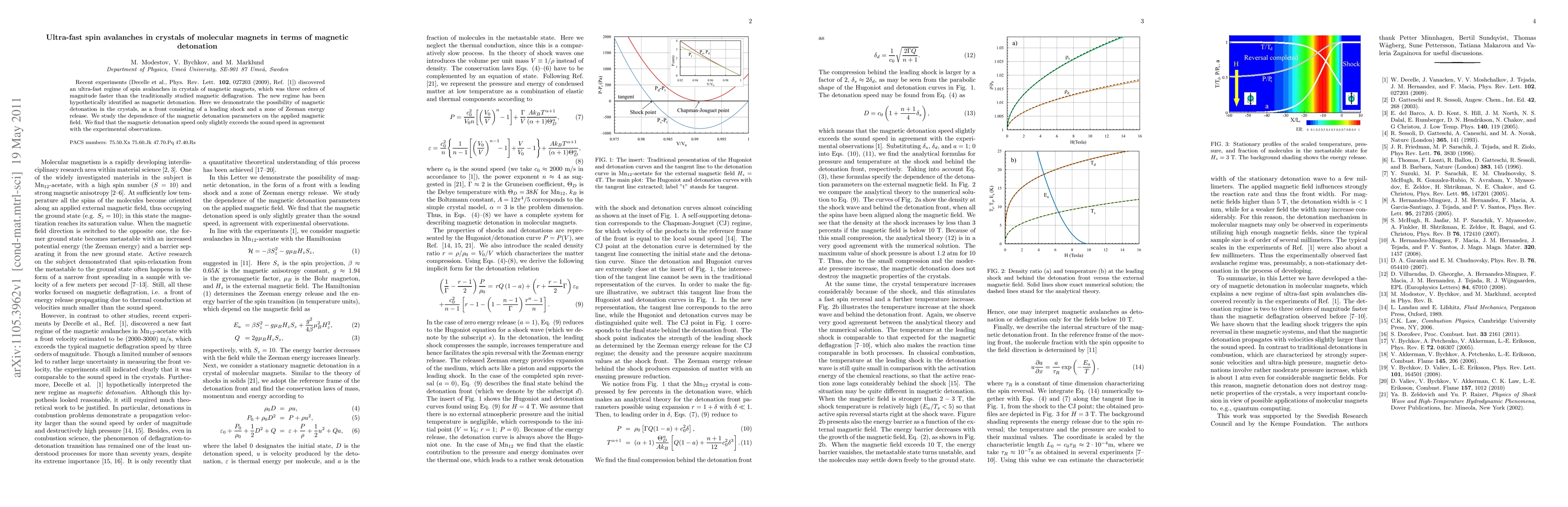 This paper investigates ultra-fast spin avalanches in molecular magnet crystals, termed magnetic detonation, which occur three orders of magnitude faster than traditional magnetic deflagration. The study demonstrates the feasibility of this phenomenon as a shock front with Zeeman energy release, and analyzes its dependence on applied magnetic fields, finding detonation speed to slightly exceed sound speed.