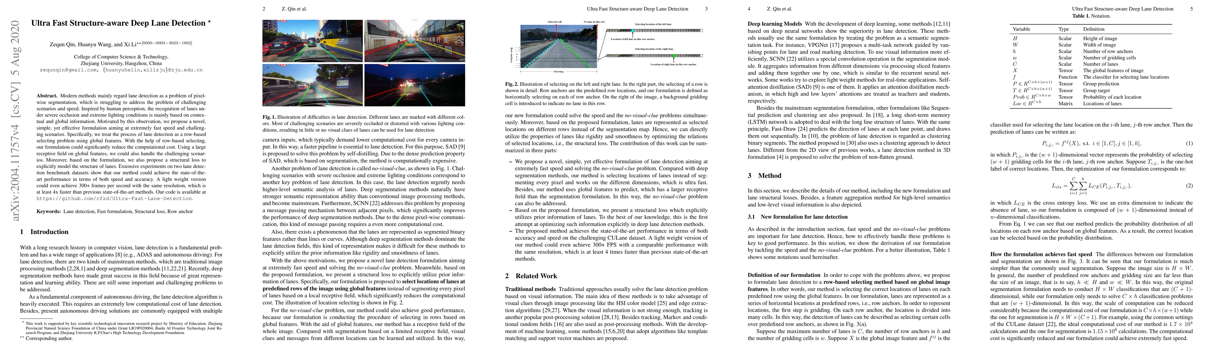 This paper proposes a novel, ultra-fast lane detection method that treats lane detection as a row-based selection problem using global features, significantly reducing computational cost and achieving state-of-the-art performance in speed and accuracy. The method includes a structural loss to model lane structure and is up to 4x faster than previous methods.