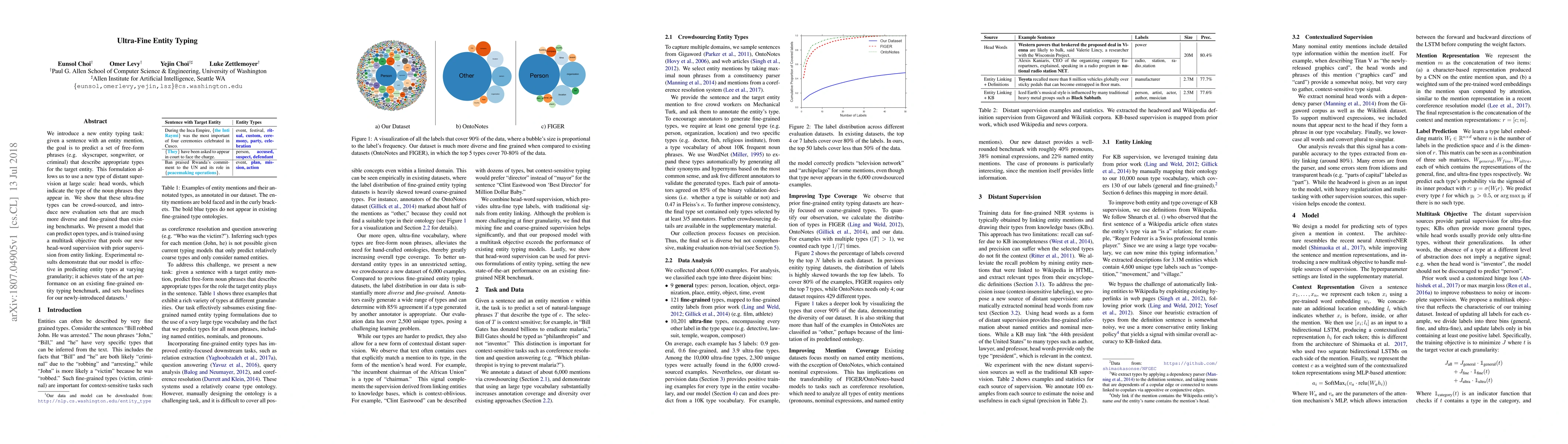 This paper introduces a new ultra-fine entity typing task that predicts detailed types for entities in sentences, using head words for distant supervision. The authors present a model achieving state-of-the-art performance on existing benchmarks and introduce new diverse datasets for fine-grained evaluation.