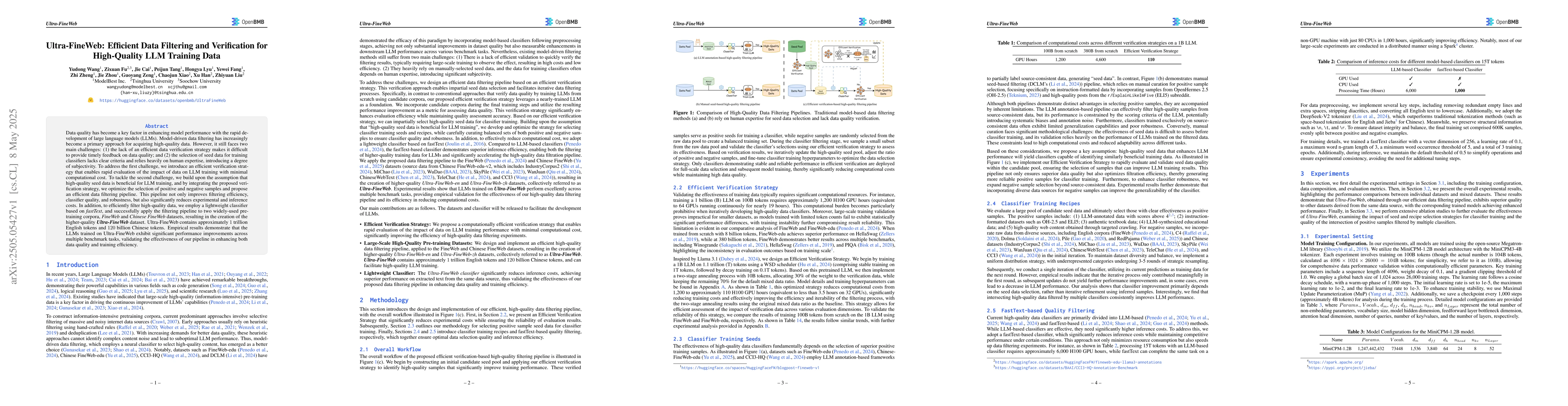 Ultra-FineWeb introduces an efficient data filtering and verification strategy to enhance large language model training data quality, addressing challenges in data verification and seed selection. The proposed pipeline optimizes the selection of high-quality seed data, significantly improving filtering efficiency and model performance across benchmark tasks.