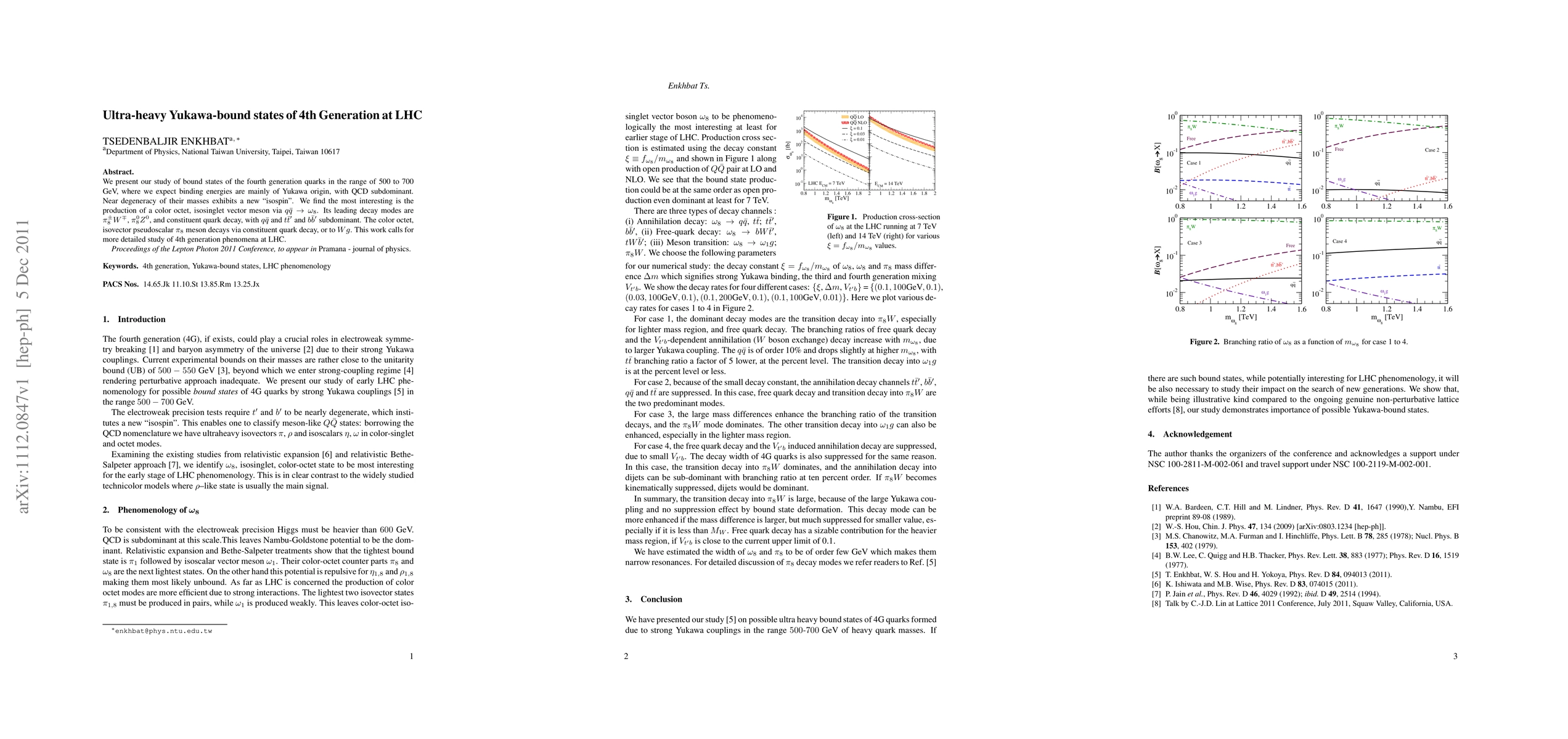 We present our study of bound states of the fourth generation quarks in the range of 500 to 700 GeV,where we expect binding energies are mainly of Yukawa origin, with QCD subdominant. Near degeneracy of their masses exhibits a new "isospin". We find the most interesting is the production of a color octet, isosinglet vector meson via $q\bar q \to \omega_8$. Its leading decay modes are $\pi_8^\pm W^\mp$, $\pi_8^0Z^0$, and constituent quark decay, with $q\bar q$ and $t\bar t'$ and $b\bar b'$ subdominant. The color octet, isovector pseudoscalar $\pi_8$ meson decays via constituent quark decay, or to $Wg$. This work calls for more detailed study of 4th generation phenomena at LHC.
