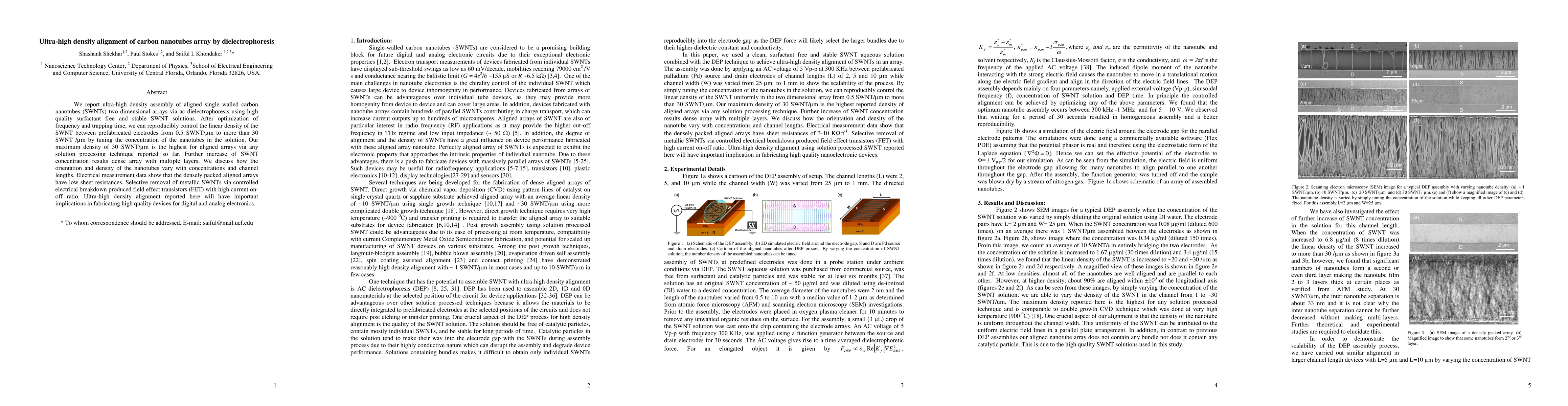 This paper describes a method for assembling ultra-high density aligned arrays of single-walled carbon nanotubes (SWNTs) using ac dielectrophoresis, achieving a maximum density of 30 SWNTs per micrometer. The technique allows precise control over alignment density by adjusting nanotube concentration and process parameters.