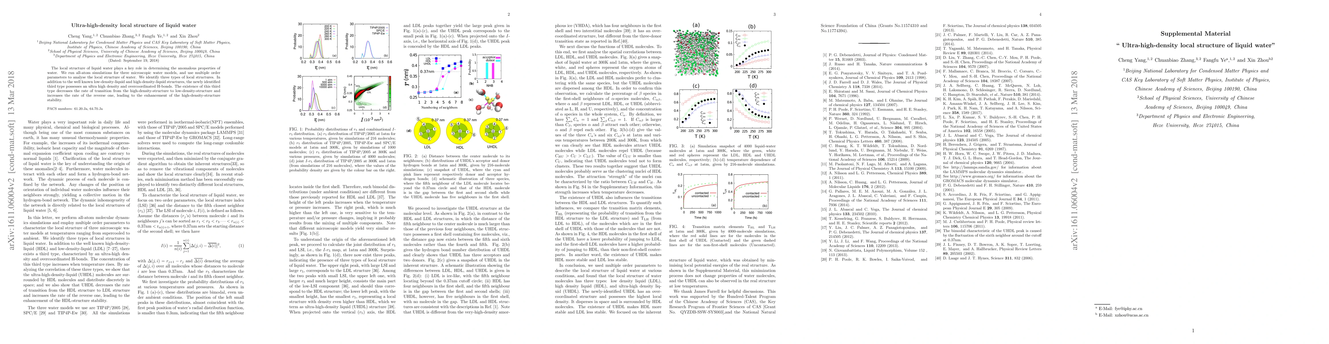 This study uses all-atom simulations to analyze the local structure of liquid water, identifying three types of structures, including a newly discovered ultra-high-density type with overcoordinated hydrogen bonds. This third structure enhances the stability of the high-density-liquid phase by slowing the transition to low-density and accelerating the reverse process.