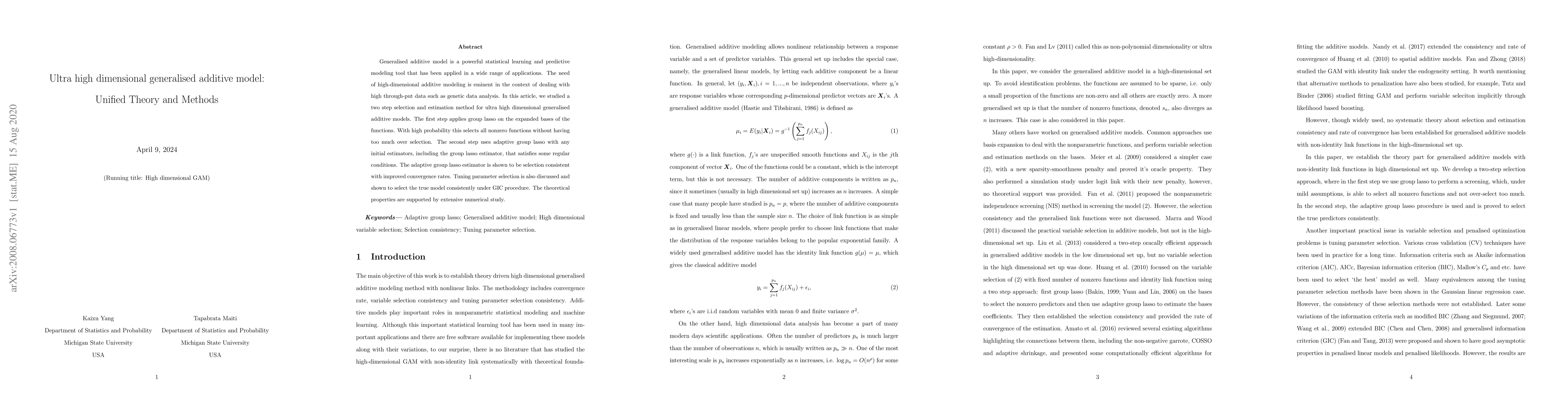 This paper proposes a two-step method for ultra high-dimensional generalized additive models, utilizing group lasso for initial function selection and adaptive group lasso for improved estimation and selection consistency, supported by theoretical and numerical validation.