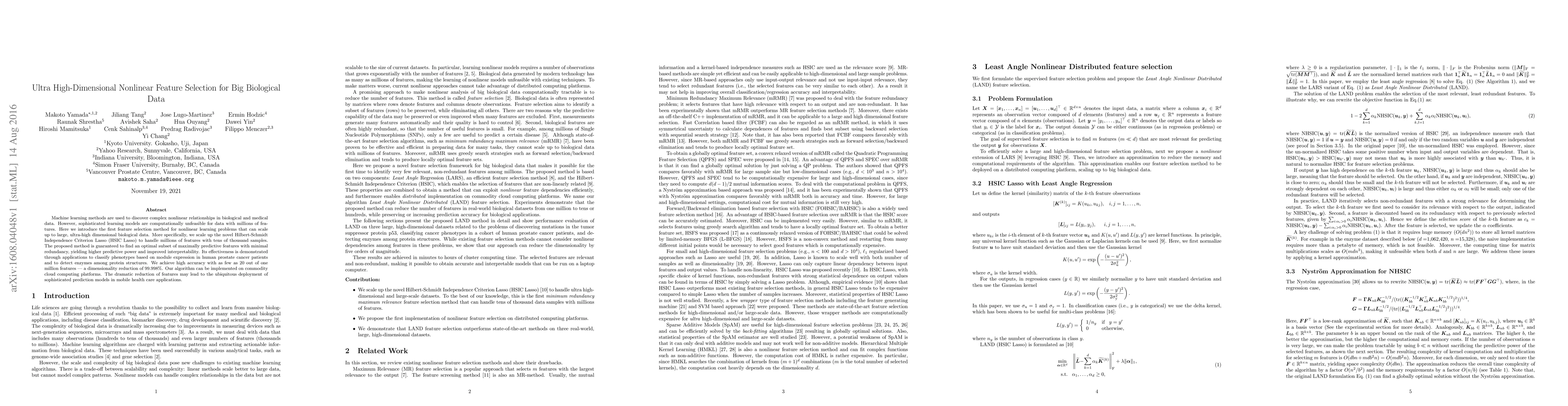 This paper introduces a novel feature selection method, scaling up the Hilbert-Schmidt Independence Criterion Lasso (HSIC Lasso), to efficiently handle ultra-high dimensional biological data. The method achieves high predictive accuracy using a minimal subset of features, demonstrating its effectiveness in classifying prostate cancer and detecting enzymes.
