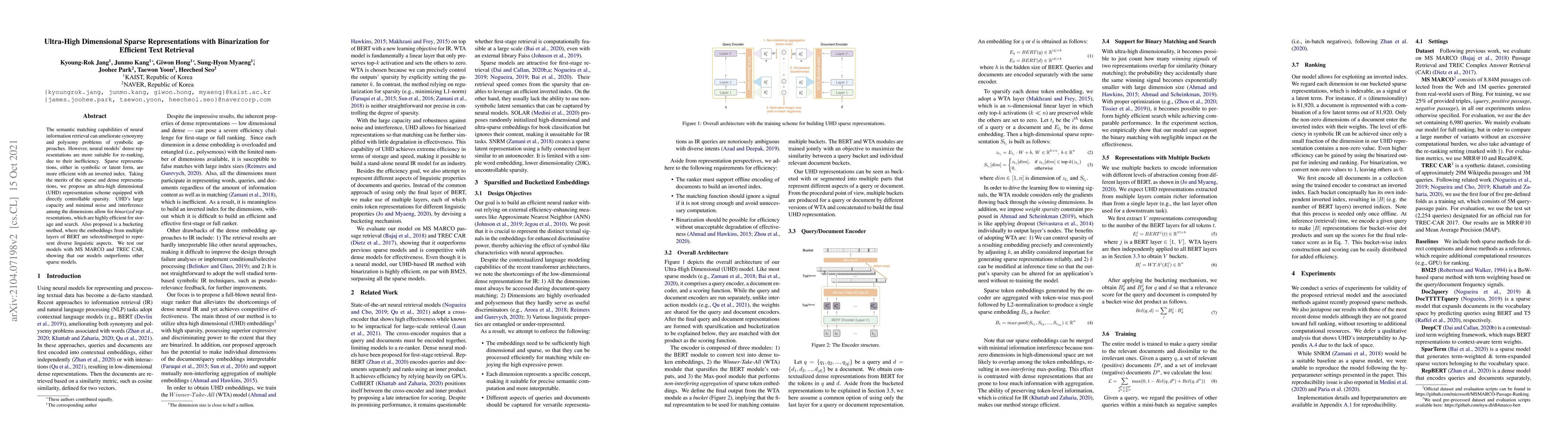 The semantic matching capabilities of neural information retrieval can ameliorate synonymy and polysemy problems of symbolic approaches. However, neural models' dense representations are more suitable for re-ranking, due to their inefficiency. Sparse representations, either in symbolic or latent form, are more efficient with an inverted index. Taking the merits of the sparse and dense representations, we propose an ultra-high dimensional (UHD) representation scheme equipped with directly controllable sparsity. UHD's large capacity and minimal noise and interference among the dimensions allow for binarized representations, which are highly efficient for storage and search. Also proposed is a bucketing method, where the embeddings from multiple layers of BERT are selected/merged to represent diverse linguistic aspects. We test our models with MS MARCO and TREC CAR, showing that our models outperforms other sparse models