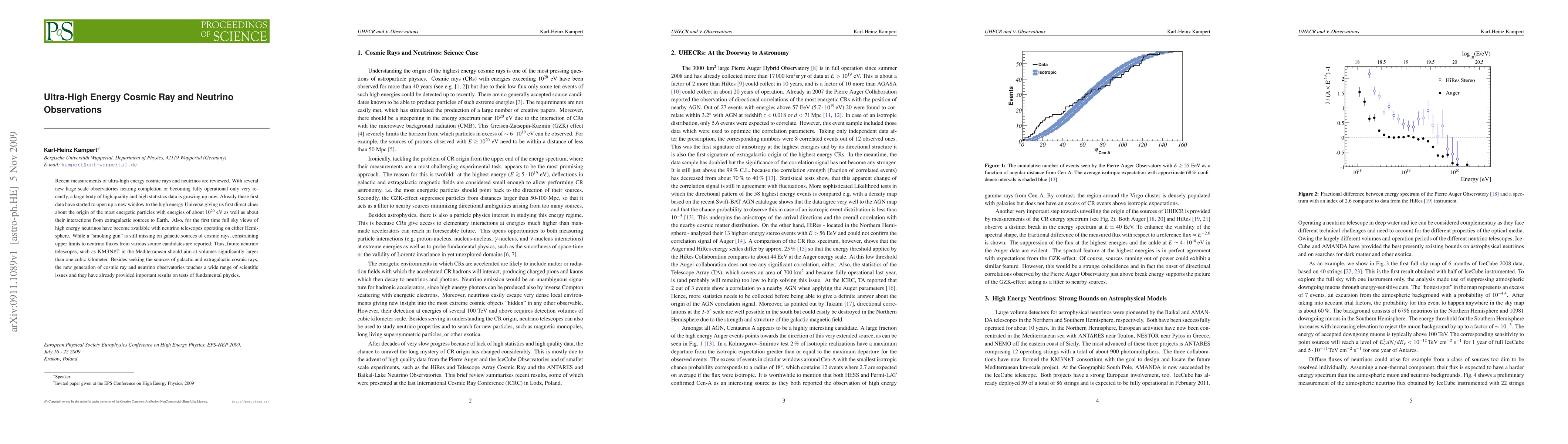 This paper reviews recent observations of ultra-high energy cosmic rays and neutrinos, highlighting the growing data from new observatories. These first data provide insights into the origins of the most energetic particles and their interactions, while also offering the first full sky views of high energy neutrinos.