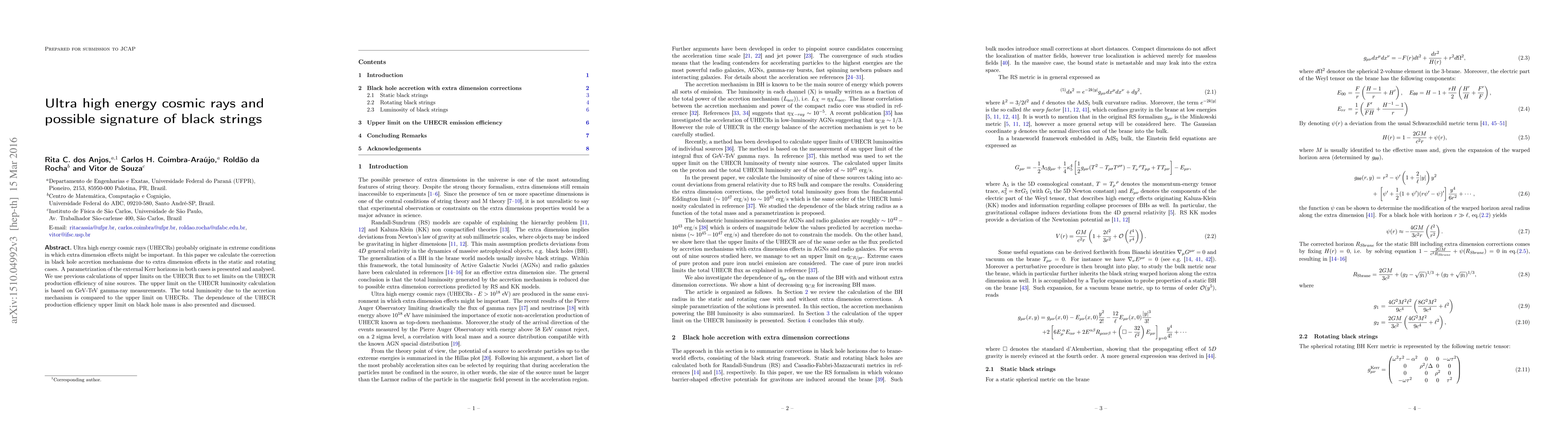 Ultra high energy cosmic rays (UHECRs) probably originate in extreme conditions in which extra dimension effects might be important. In this paper we calculate the correction in black hole accretion mechanisms due to extra dimension effects in the static and rotating cases. A parametrization of the external Kerr horizons in both cases is presented and analysed. We use previous calculations of upper limits on the UHECR flux to set limits on the UHECR production efficiency of nine sources. The upper limit on the UHECR luminosity calculation is based on GeV-TeV gamma-ray measurements. The total luminosity due to the accretion mechanism is compared to the upper limit on UHECRs. The dependence of the UHECR production efficiency upper limit on black hole mass is also presented and discussed