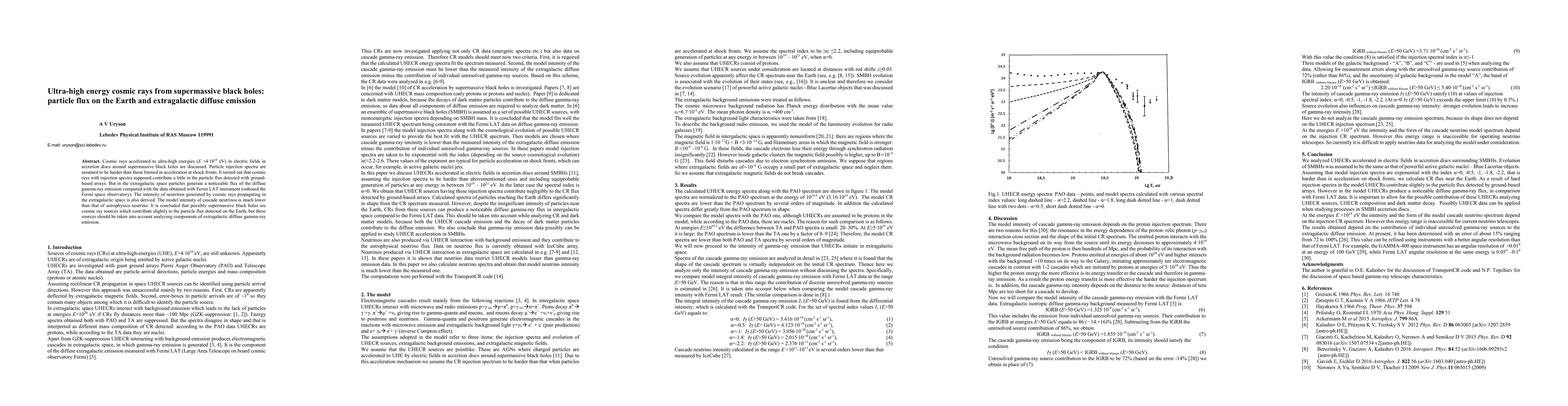 This paper explores ultra-high energy cosmic rays from supermassive black holes, finding they contribute minimally to Earth's particle flux but significantly to extragalactic diffuse gamma-ray emission, as observed by the Fermi LAT. The study also derives the neutrino intensity, showing it is much lower than astrophysical neutrinos.