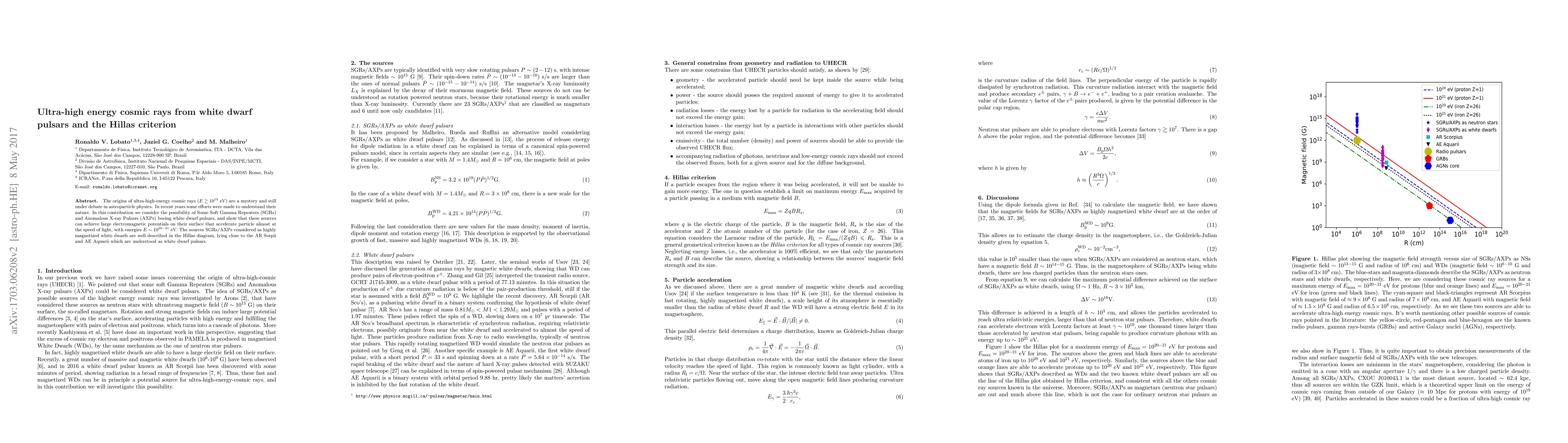 The sources of ultra-high-energy cosmic rays ($E\gtrsim10^{19}$ eV) is still an open question in astroparticle physics and in the last years some efforts were made to understand its origin. In this work we consider white dwarf pulsars (WDPs) as possible sources of these ultra energetic particles. If some Soft Gamma Repeaters (SGRs) and Anomalous X-ray Pulsars (AXPs) are considered as white dwarf pulsars, these sources can achieve large electromagnetic potentials on its surface and possibly accelerate particle almost of speed of light and with energies $E \sim 10^{20-21}$ eV. We show that the new scale of star surface magnetic field and size of SGRs/AXPs as very magnetized white dwarfs are well described in the Hillas diagram together with the AR Sorpii and AE Aquarii white dwarf pulsars recently found. SGRs/AXPs described as magnetars are much above the Hillas line and out of it is expected for normal neutron star pulsars.