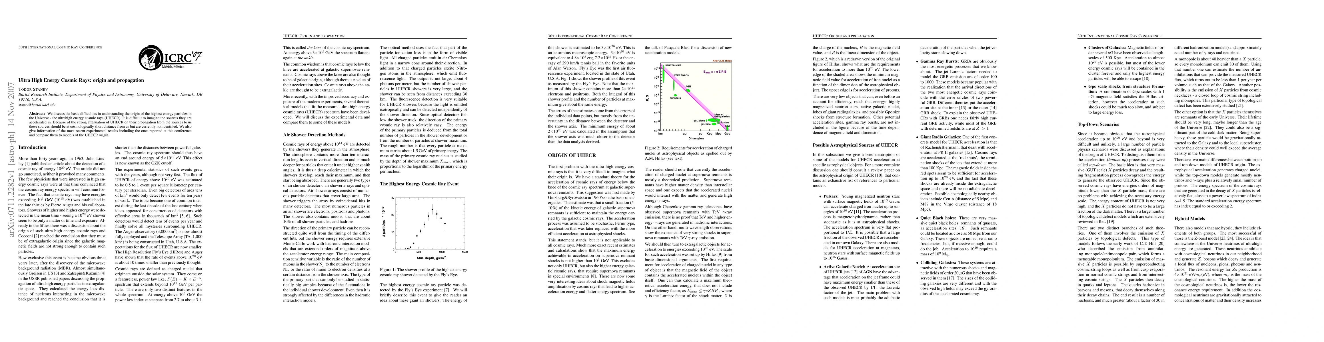 This paper addresses the challenges in identifying the sources of ultra high energy cosmic rays (UHECR) and their propagation, emphasizing the strong attenuation of these particles over long distances. It reviews recent experimental findings and compares them with existing models of UHECR origins.