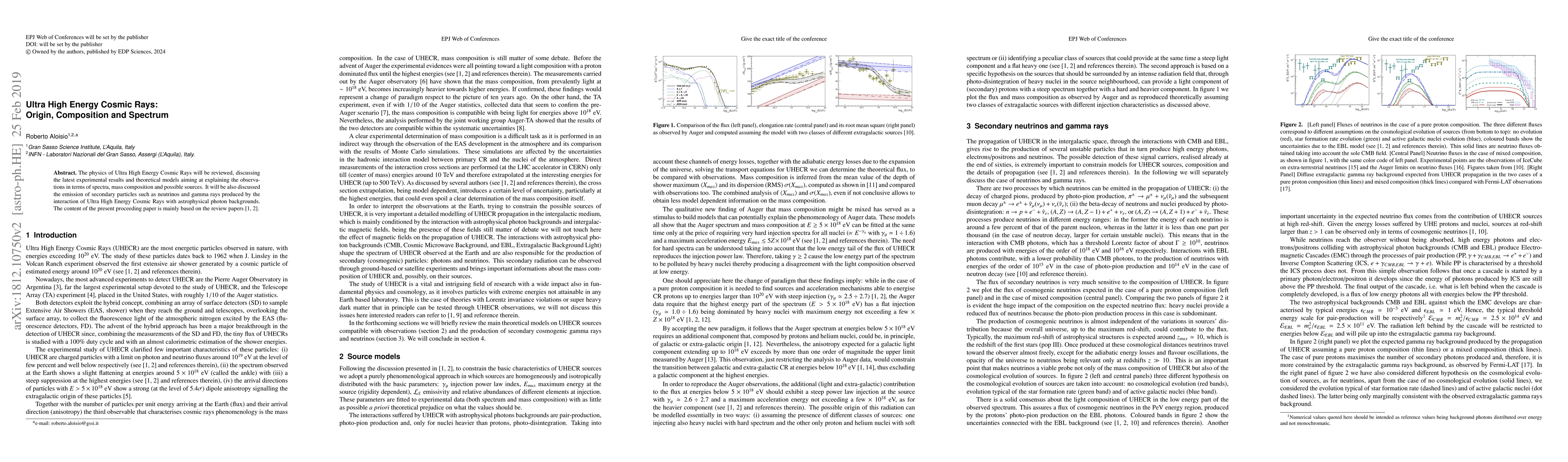 This paper reviews Ultra High Energy Cosmic Rays, focusing on their spectra, mass composition, and potential sources, alongside the secondary particles like neutrinos and gamma rays generated from their interactions with astrophysical photon backgrounds. It synthesizes the latest experimental findings and theoretical models.