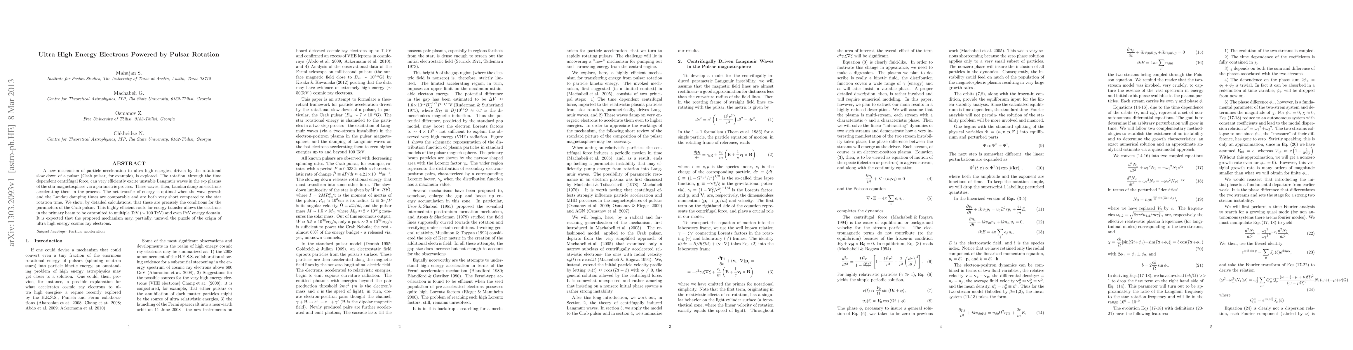 A new mechanism of particle acceleration to ultra high energies, driven by the rotational slow down of a pulsar (Crab pulsar, for example), is explored. The rotation, through the time dependent centrifugal force, can very efficiently excite unstable Langmuir waves in the e-p plasma of the star magnetosphere via a parametric process. These waves, then, Landau damp on electrons accelerating them in the process. The net transfer of energy is optimal when the wave growth and the Landau damping times are comparable and are both very short compared to the star rotation time. We show, by detailed calculations, that these are precisely the conditions for the parameters of the Crab pulsar. This highly efficient route for energy transfer allows the electrons in the primary beam to be catapulted to multiple TeV ($\sim 100$ TeV) and even PeV energy domain. It is expected that the proposed mechanism may, partially, unravel the puzzle of the origin of ultra high energy cosmic ray electrons.