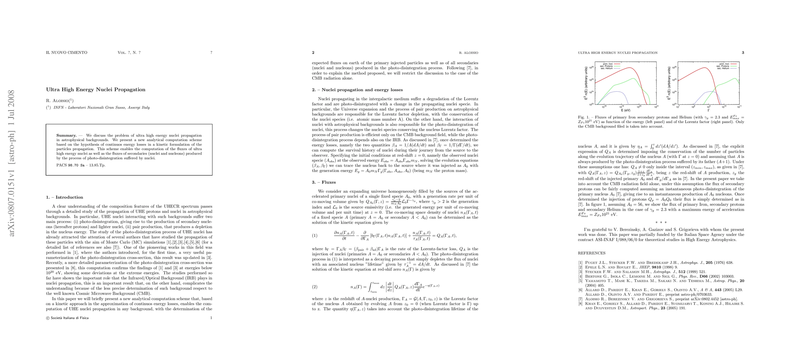 We discuss the problem of ultra high energy nuclei propagation in astrophysical backgrounds. We present a new analytical computation scheme based on the hypothesis of continuos energy losses in a kinetic formulation of the particles propagation. This scheme enables the computation of the fluxes of ultra high energy nuclei as well as the fluxes of secondaries (nuclei and nucleons) produced by the process of photo-disintegration suffered by nuclei.