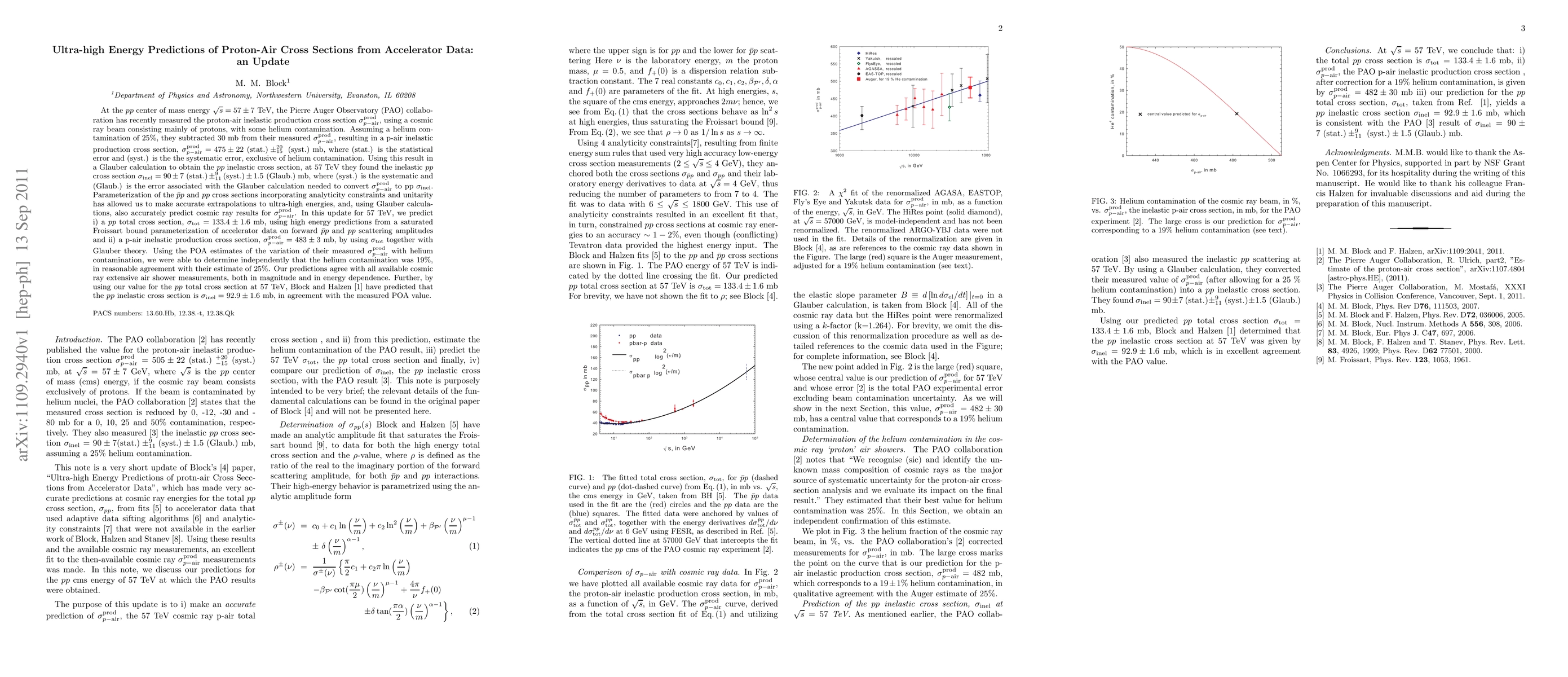 At $\sqrt s = 57\pm 7$ TeV, the Pierre Auger Observatory (PAO) collaboration has recently measured the proton-air inelastic production cross section $\sigma_{\rm p-air}$. Assuming a helium contamination of 25%, they subtracted 30 mb from their measured value, resulting in a p-air inelastic production cross section, $\sigma_{\rm p-air}=475 \pm 22\ ({\rm stat.})\pm^{20}_{15} \ ({\rm syst.})$ mb, exclusive of helium contamination. Using this result in a Glauber calculation to obtain the $pp$ inelastic cross section, they found the inelastic $pp$ cross section $\sigma_{\rm inel}= 90\pm 7\ ({\rm stat.}) \pm^9_{11} ({\rm syst.}) \pm 1.5 {\rm \ (Glaub.})$ mb. Parameterization of the $\bar pp$ and $pp$ cross sections incorporating analyticity constraints and unitarity has allowed us to make accurate extrapolations to ultra-high energies, and using Glauber calculations, accurately predict cosmic ray results for $\spai$. In this update for 57 TeV, we predict i) a $pp$ total cross section, $\sigma_{\rm tot}=133.4\pm 1.6$ mb, using high energy predictions from a saturated Froissart bound parameterization of accelerator data on forward $\bar pp$ and $pp$ scattering amplitudes and ii) a p-air inelastic production cross section, $\sigma_{\rm p-air}=483\pm 3 $ mb, by using $\sigma_{\rm tot}$ together with Glauber theory, allowing us to determine independently that the helium contamination was 19%, in reasonable agreement with their estimate of 25%. Our predictions agree with all available cosmic ray extensive air shower measurements, both in magnitude and in energy dependence. By using our value for the $pp$ total cross section at 57 TeV, Block and Halzen \cite{blackdisk} have predicted that the $pp$ inelastic cross section is $\sigma_{\rm inel}= 92.9\pm 1.6$ mb, in agreement with the measured POA value.