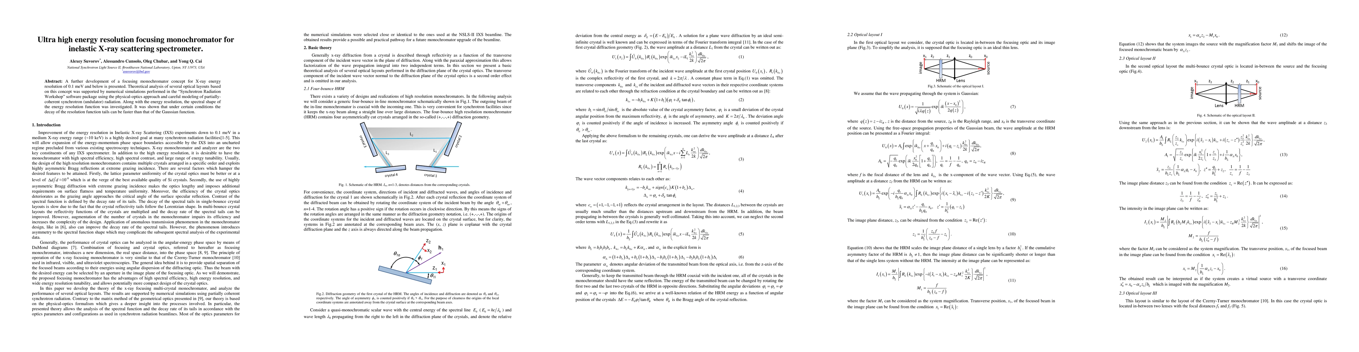 This paper presents an advanced focusing monochromator design achieving ultra-high energy resolution of 0.1 meV or below for inelastic X-ray scattering spectrometers. Theoretical analysis and numerical simulations using the "Synchrotron Radiation Workshop" software demonstrated that under specific conditions, the resolution function decays faster than a Gaussian function.