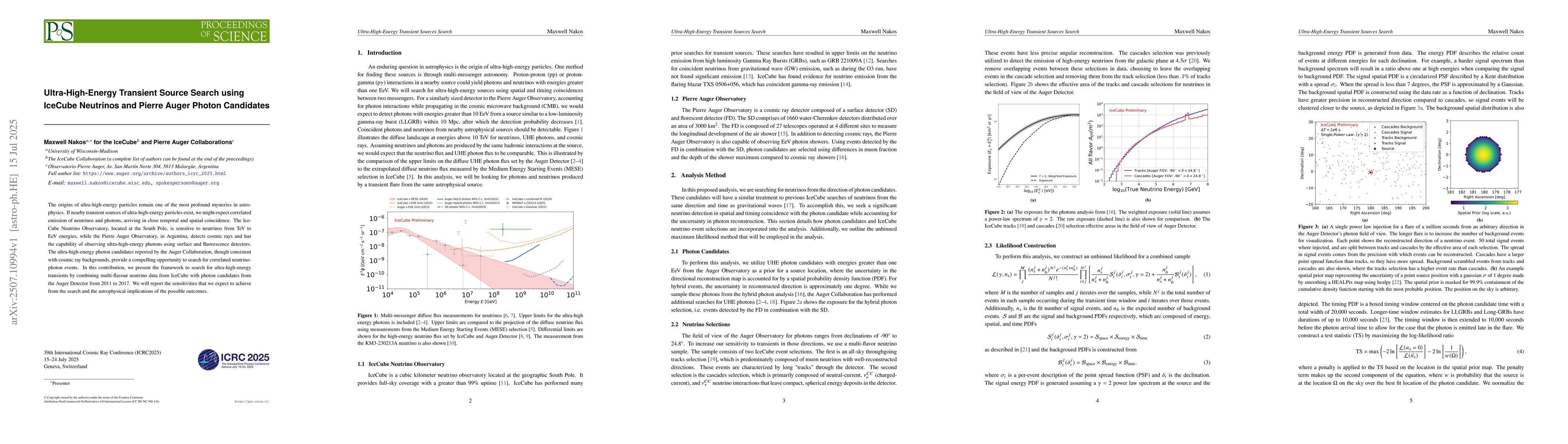 The origins of ultra-high-energy particles remain one of the most profound mysteries in astrophysics. If nearby transient sources of ultra-high-energy particles exist, we might expect correlated emission of neutrinos and photons, arriving in close temporal and spatial coincidence. The IceCube Neutrino Observatory, located at the South Pole, is sensitive to neutrinos from TeV to EeV energies, while the Pierre Auger Observatory, in Argentina, detects cosmic rays and has the capability of observing ultra-high-energy photons using surface and fluorescence detectors. The ultra-high-energy photon candidates reported by the Auger Collaboration, though consistent with cosmic ray backgrounds, provide a compelling opportunity to search for correlated neutrino-photon events. In this contribution, we present the framework to search for ultra-high-energy transients by combining multi-flavour neutrino data from IceCube with photon candidates from the Auger Detector from 2011 to 2017. We will report the sensitivities that we expect to achieve from the search and the astrophysical implications of the possible outcomes.