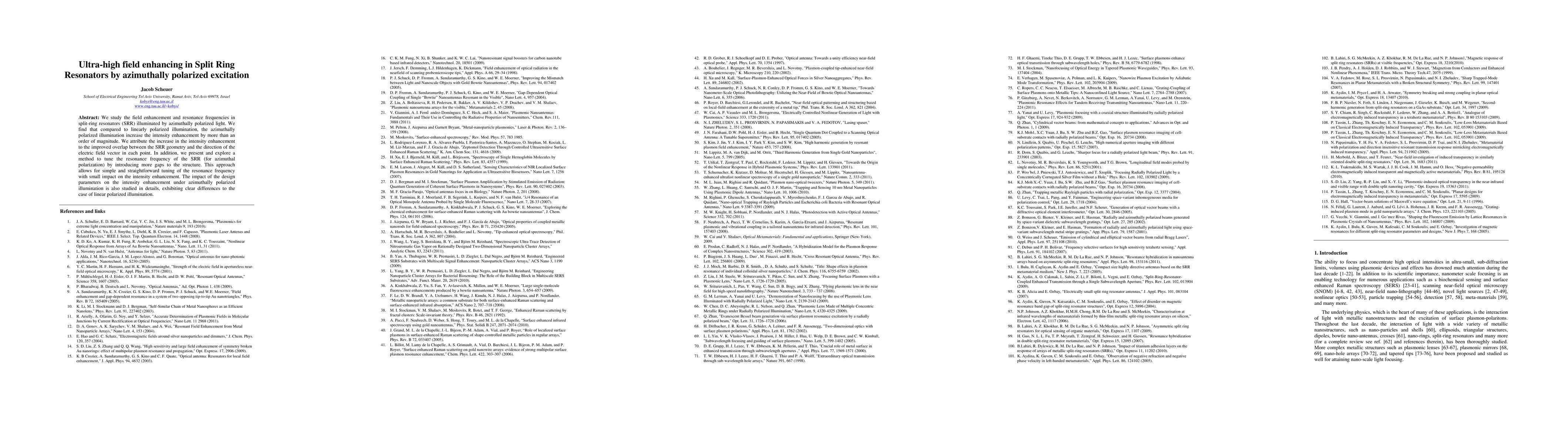 Research shows that azimuthally polarized light significantly increases intensity enhancement in Split Ring Resonators (SRRs) compared to linearly polarized illumination, with the potential for simple tuning of resonance frequency.