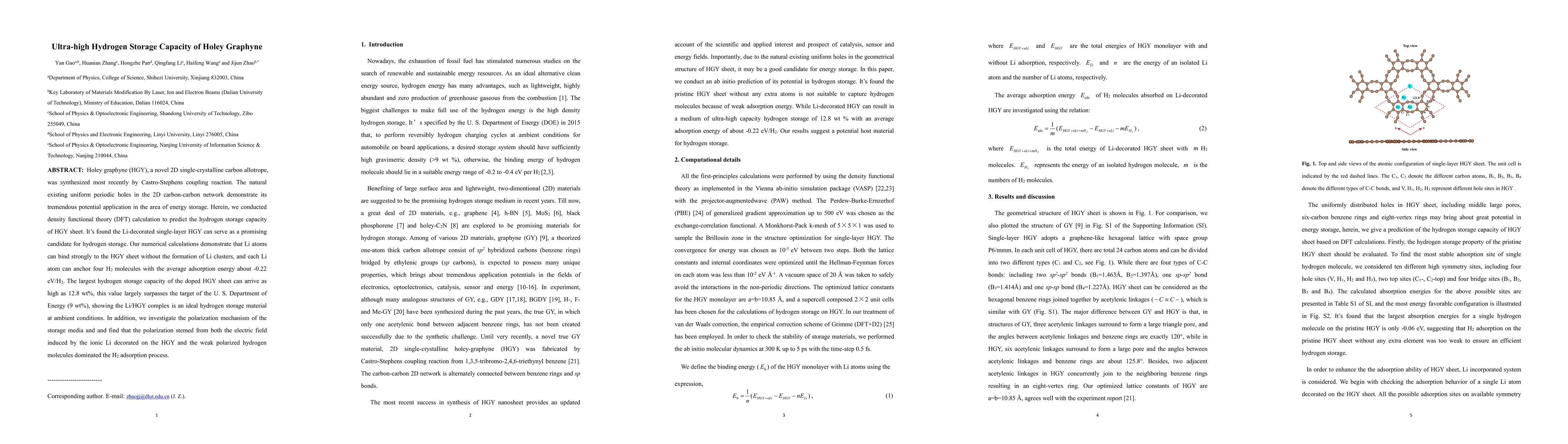 **Summary:** Holey graphyne (HGY) synthesized via Castro-Stephens coupling shows potential for ultra-high hydrogen storage capacity. Density functional theory calculations reveal that Li-decorated HGY can adsorb up to 12.8 wt% hydrogen, surpassing DOE targets, with each Li atom anchoring four H2 molecules. The adsorption mechanism involves polarization from Li ions and weakly polarized H2 molecules.