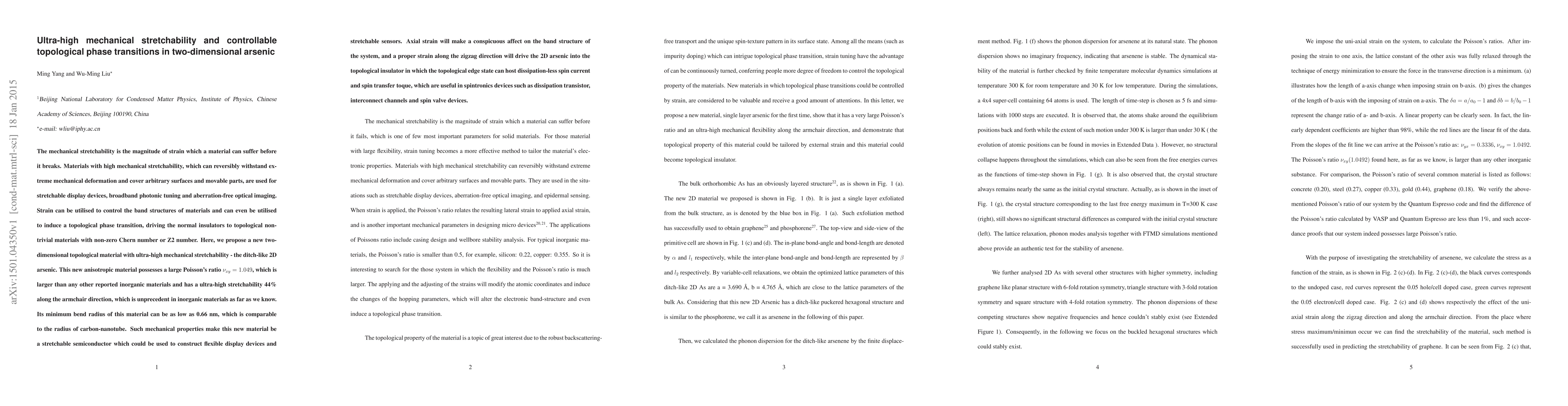 The mechanical stretchability is the magnitude of strain which a material can suffer before it breaks. Materials with high mechanical stretchability, which can reversibly withstand extreme mechanical deformation and cover arbitrary surfaces and movable parts, are used for stretchable display devices, broadband photonic tuning and aberration-free optical imaging. Strain can be utilised to control the band structures of materials and can even be utilised to induce a topological phase transition, driving the normal insulators to topological non-trivial materials with non-zero Chern number or Z2 number. Here, we propose a new two-dimensional topological material with ultra-high mechanical stretchability - the ditch-like 2D arsenic. This new anisotropic material possesses a large Poisson's ratio 1.049, which is larger than any other reported inorganic materials and has a ultra-high stretchability 44% along the armchair direction, which is unprecedent in inorganic materials as far as we know. Its minimum bend radius of this material can be as low as 0.66 nm, which is comparable to the radius of carbon-nanotube. Such mechanical properties make this new material be a stretchable semiconductor which could be used to construct flexible display devices and stretchable sensors. Axial strain will make a conspicuous affect on the band structure of the system, and a proper strain along the zigzag direction will drive the 2D arsenic into the topological insulator in which the topological edge state can host dissipation-less spin current and spin transfer toque, which are useful in spintronics devices such as dissipation transistor, interconnect channels and spin valve devices.