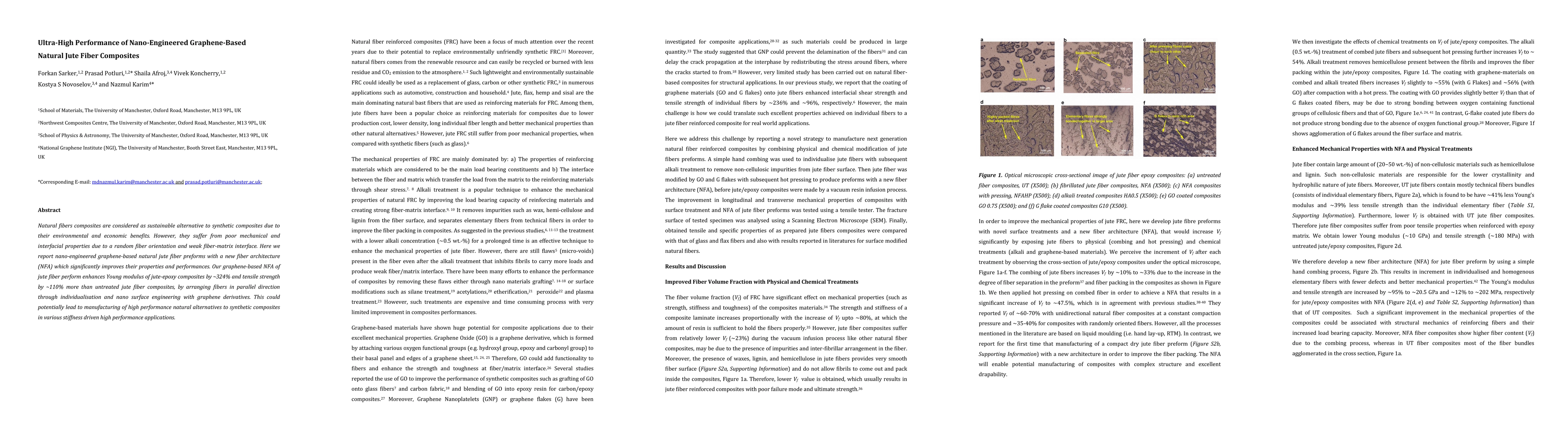 This paper explores the enhancement of natural jute fiber composites using nano-engineered graphene-based preforms, achieving a 324% increase in Young modulus and a 110% rise in tensile strength by optimizing fiber orientation and surface treatment, paving the way for sustainable high-performance alternatives to synthetic composites.