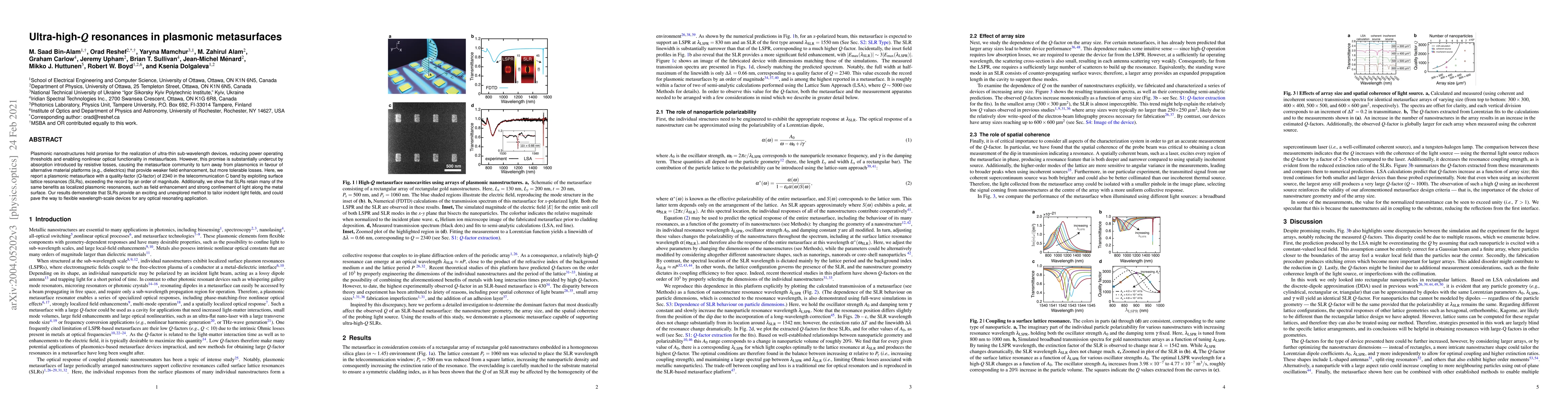 This paper reports a plasmonic metasurface achieving an ultra-high Q-factor of 2340 in the C band by utilizing surface lattice resonances, significantly reducing resistive losses and surpassing previous records. The study highlights that these resonances offer strong field enhancement and light confinement, potentially enabling flexible, wavelength-scale devices for optical applications.