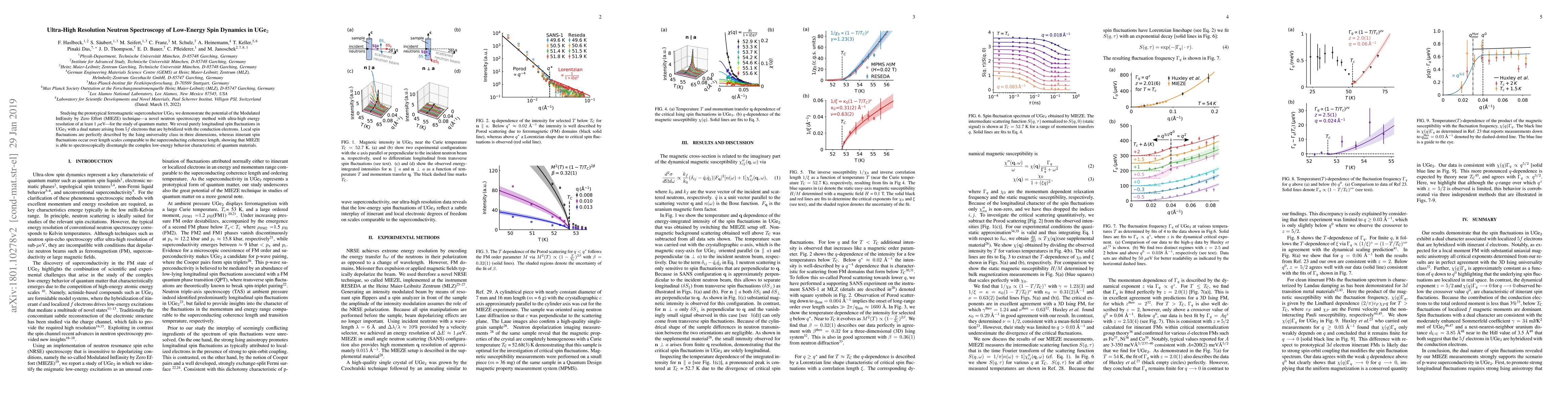 The research utilizes the MIEZE technique to achieve ultra-high resolution neutron spectroscopy in UGe$_2$, revealing distinct longitudinal spin fluctuations from hybridized $5f$ and conduction electrons. It demonstrates the method's ability to separate local (Ising universality class) and itinerant spin fluctuations, aiding in understanding quantum material behavior.