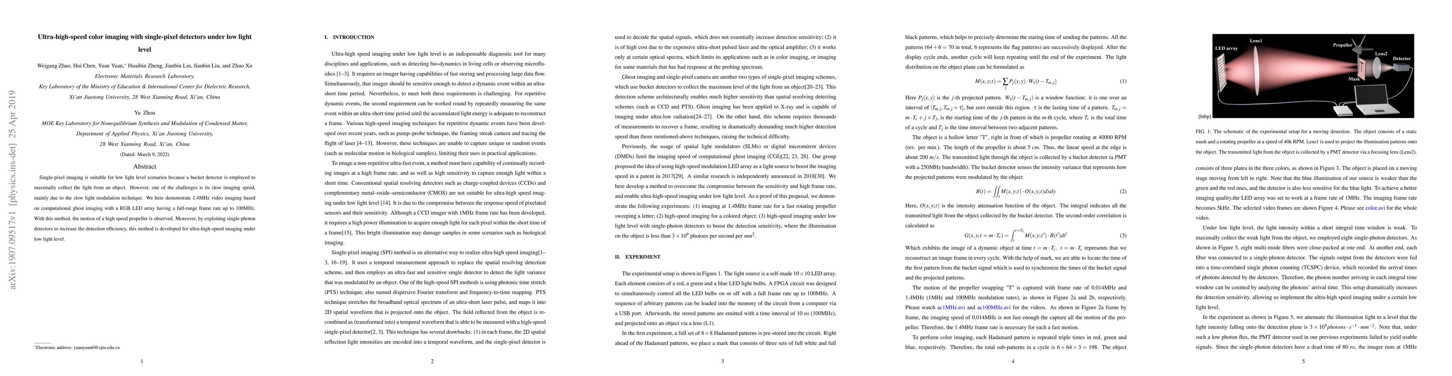 This paper demonstrates ultra-high-speed color imaging at 1.4MHz using computational ghost imaging with an RGB LED array, overcoming the slow speed of traditional single-pixel detectors. The method employs single-photon detectors to enhance efficiency, enabling effective imaging under low light conditions, as shown by capturing the motion of a high-speed propeller.