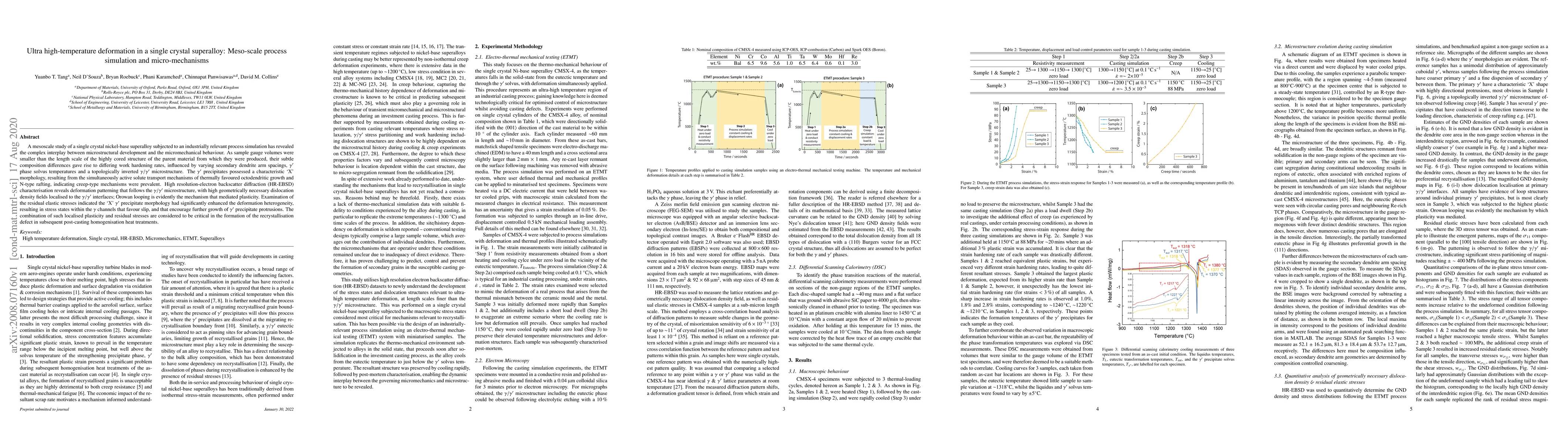This study investigates the ultra high-temperature deformation of a single crystal nickel-base superalloy, revealing that microstructural variations lead to differing work hardening rates and deformation patterns. High geometrically necessary dislocation density at gamma/gamma-prime interfaces suggests Orowan looping as the dominant plasticity mechanism.