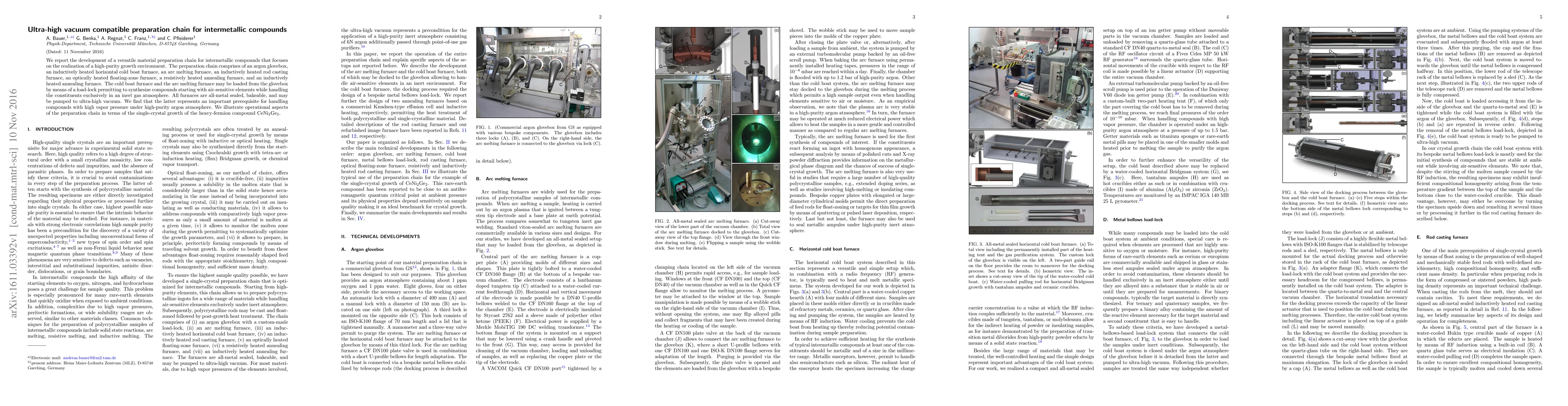 This paper details a comprehensive material preparation chain for synthesizing intermetallic compounds in an ultra-high vacuum environment, utilizing various furnaces and an argon glovebox to ensure high purity. The chain enables the growth of compounds like CeNi2Ge2, emphasizing the importance of vacuum conditions for handling materials with high vapor pressures.