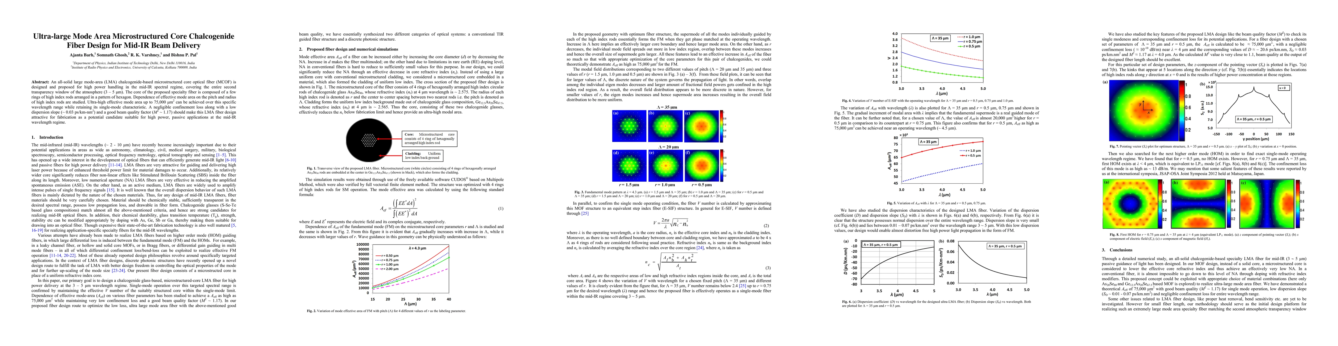 This paper proposes a large mode area chalcogenide microstructured core optical fiber for high power delivery in the mid-IR spectrum, achieving an effective mode area of up to 75,000 micron square while maintaining single mode characteristics and low dispersion.
