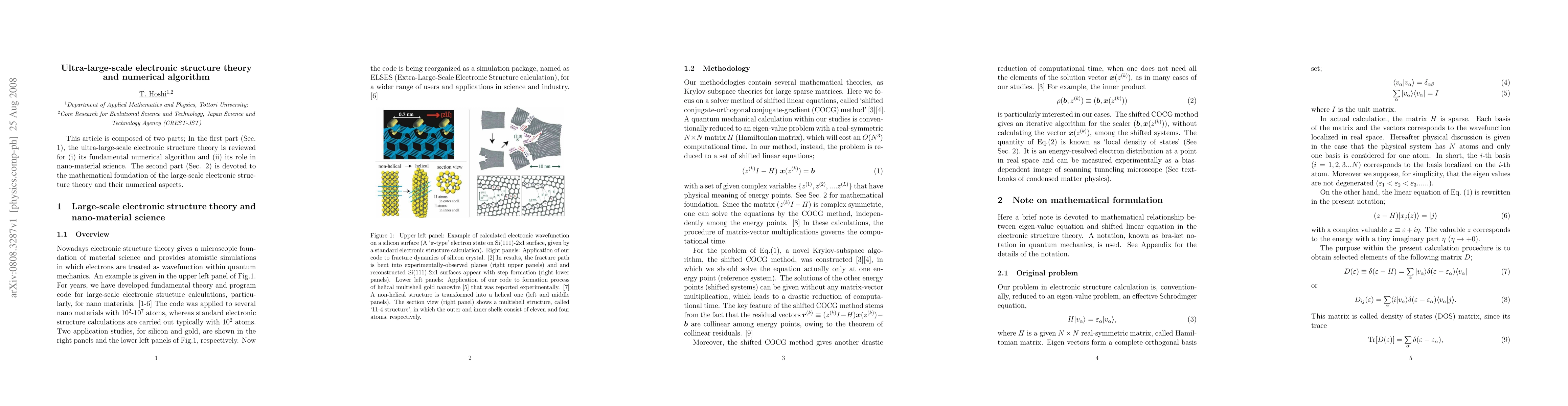 This article is composed of two parts; In the first part (Sec. 1), the ultra-large-scale electronic structure theory is reviewed for (i) its fundamental numerical algorithm and (ii) its role in nano-material science. The second part (Sec. 2) is devoted to the mathematical foundation of the large-scale electronic structure theory and their numerical aspects.