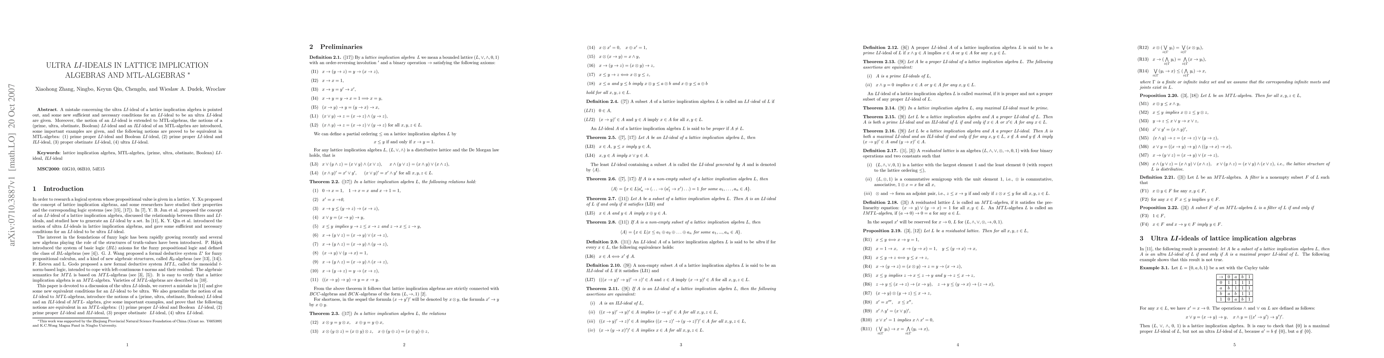 A mistake concerning the ultra \textit{LI}-ideal of a lattice implication algebra is pointed out, and some new sufficient and necessary conditions for an \textit{LI}-ideal to be an ultra \textit{LI}-ideal are given. Moreover, the notion of an \textit{LI}-ideal is extended to MTL-algebras, the notions of a (prime, ultra, obstinate, Boolean) \textit{LI}-ideal and an \textit{ILI}-ideal of an MTL-algebra are introduced, some important examples are given, and the following notions are proved to be equivalent in MTL-algebra: (1) prime proper \textit{LI}-ideal and Boolean \textit{LI}-ideal, (2) prime proper \textit{LI}-ideal and \textit{ILI}-ideal, (3) proper obstinate \textit{LI}-ideal, (4) ultra \textit{LI}-ideal.