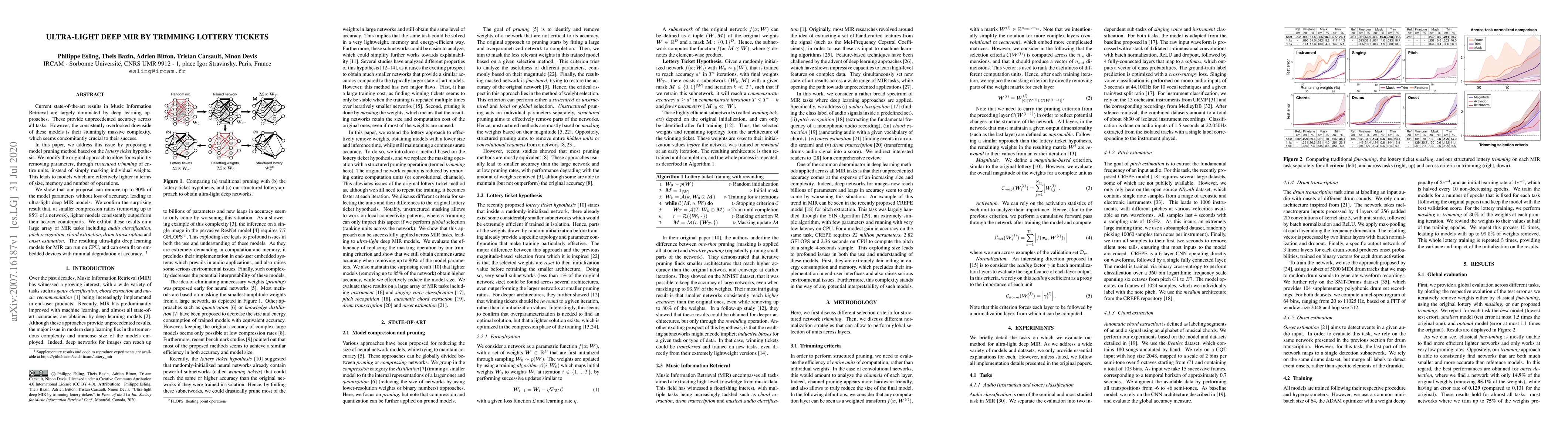 Current state-of-the-art results in Music Information Retrieval are largely dominated by deep learning approaches. These provide unprecedented accuracy across all tasks. However, the consistently overlooked downside of these models is their stunningly massive complexity, which seems concomitantly crucial to their success. In this paper, we address this issue by proposing a model pruning method based on the lottery ticket hypothesis. We modify the original approach to allow for explicitly removing parameters, through structured trimming of entire units, instead of simply masking individual weights. This leads to models which are effectively lighter in terms of size, memory and number of operations. We show that our proposal can remove up to 90% of the model parameters without loss of accuracy, leading to ultra-light deep MIR models. We confirm the surprising result that, at smaller compression ratios (removing up to 85% of a network), lighter models consistently outperform their heavier counterparts. We exhibit these results on a large array of MIR tasks including audio classification, pitch recognition, chord extraction, drum transcription and onset estimation. The resulting ultra-light deep learning models for MIR can run on CPU, and can even fit on embedded devices with minimal degradation of accuracy.