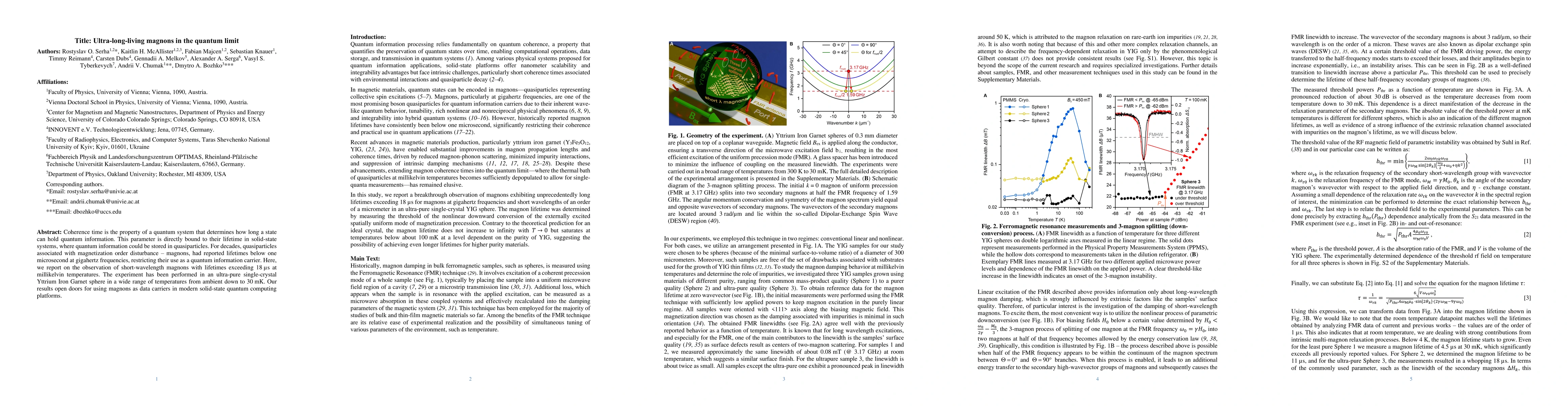 Researchers have discovered ultra-long-living magnons that can store quantum information for over 18 microseconds at millikelvin temperatures, paving the way for using them in solid-state quantum computing platforms.