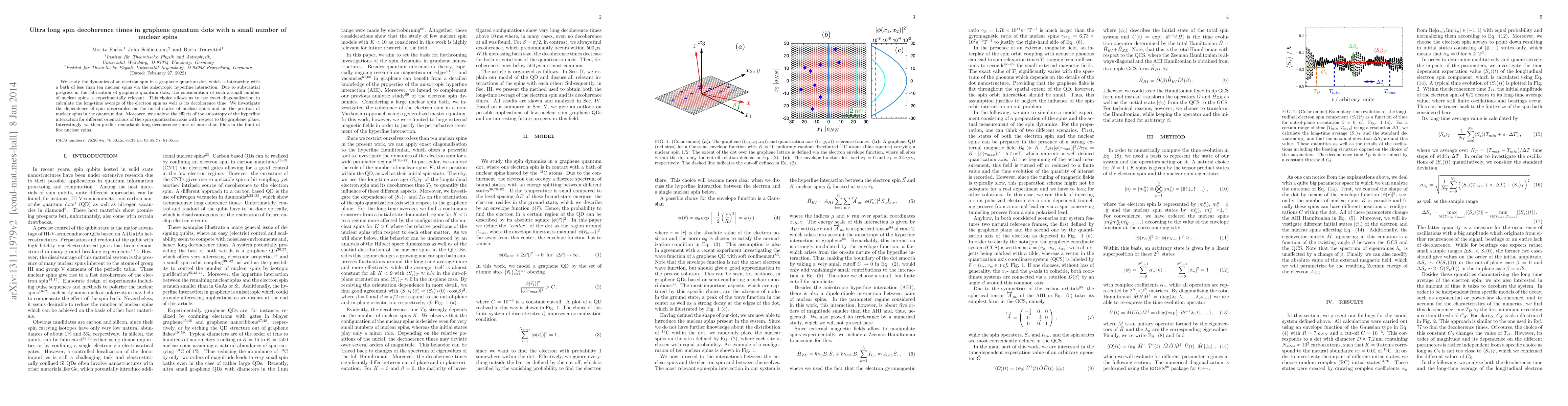 This paper investigates the electron spin dynamics in graphene quantum dots with fewer than ten nuclear spins, revealing ultra-long spin decoherence times exceeding 10ms due to the anisotropic hyperfine interaction. The study employs exact diagonalization to analyze the impact of nuclear spin initial states and positions on spin observables.