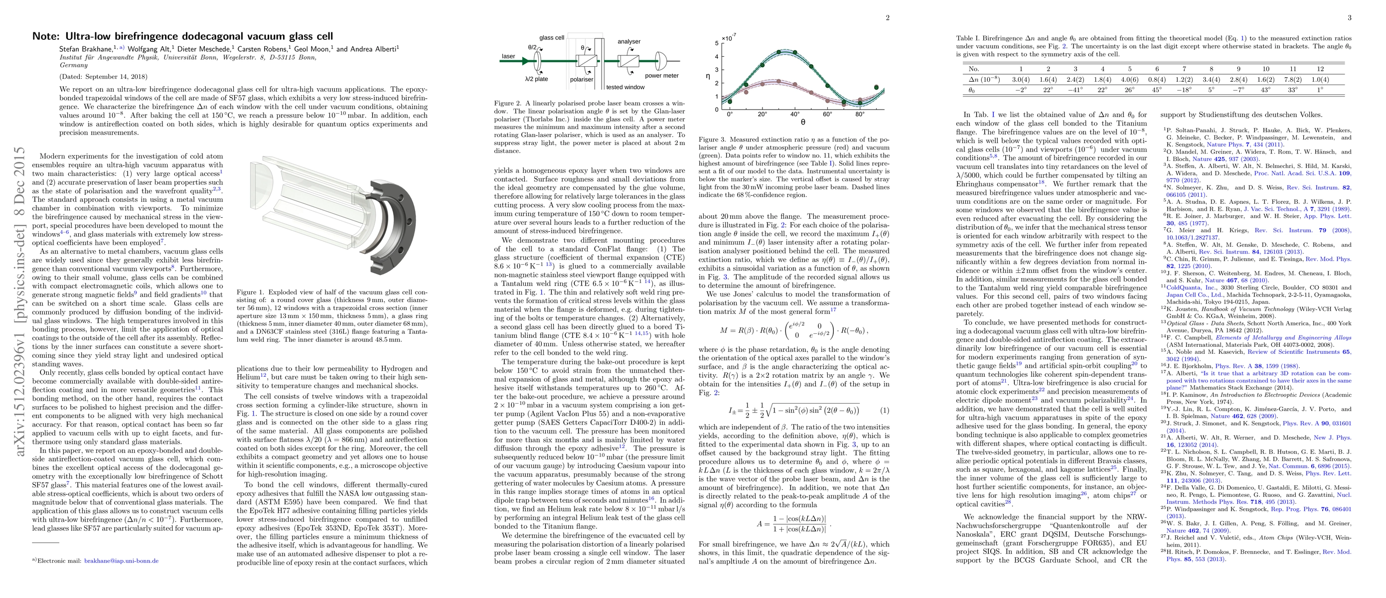 This paper reports on the development of an ultra-low birefringence dodecagonal vacuum glass cell with epoxy-bonded trapezoidal windows made of SF57 glass, achieving birefringence values around $\num{e-8}$. The cell, when baked at 150°C, reaches ultra-high vacuum pressures below $\SI{e-10}{\milli\bar}$, and is antireflection coated for quantum optics and precision measurements.
