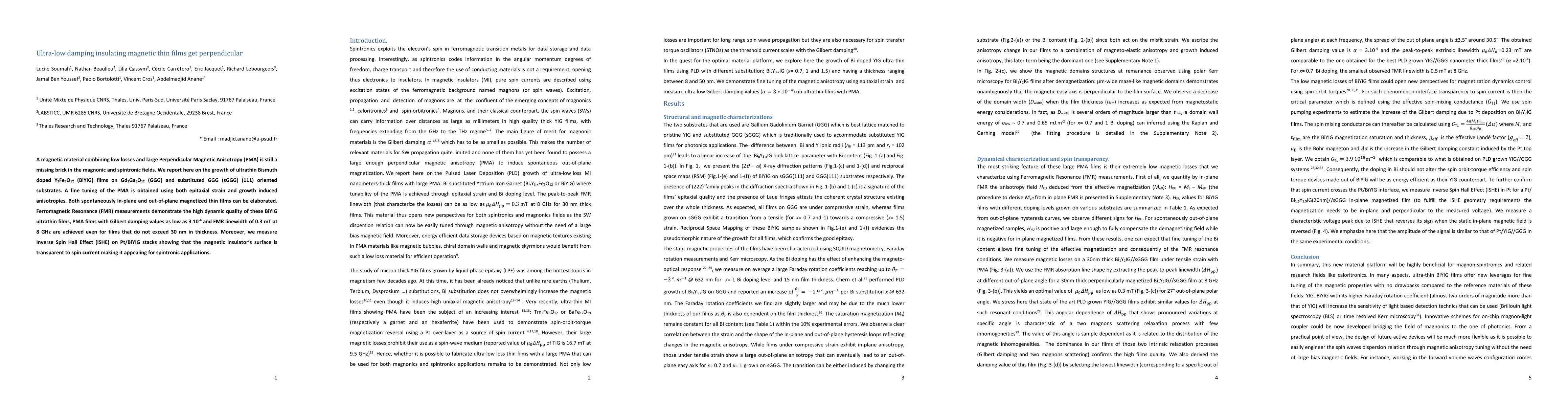 A magnetic material combining low losses and large Perpendicular Magnetic Anisotropy (PMA) is still a missing brick in the magnonic and spintronic fields. We report here on the growth of ultrathin Bismuth doped Y$_{3}$Fe$_{5}$O$_{12}$ (BiYIG) films on Gd$_{3}$Ga$_{5}$O$_{12}$ (GGG) and substituted GGG (sGGG) (111) oriented substrates. A fine tuning of the PMA is obtained using both epitaxial strain and growth induced anisotropies. Both spontaneously in-plane and out-of-plane magnetized thin films can be elaborated. Ferromagnetic Resonance (FMR) measurements demonstrate the high dynamic quality of these BiYIG ultrathin films, PMA films with Gilbert damping values as low as 3 10$^{-4}$ and FMR linewidth of 0.3 mT at 8 GHz are achieved even for films that do not exceed 30 nm in thickness. Moreover, we measure Inverse Spin Hall Effect (ISHE) on Pt/BiYIG stacks showing that the magnetic insulator$'$s surface is transparent to spin current making it appealing for spintronic applications.