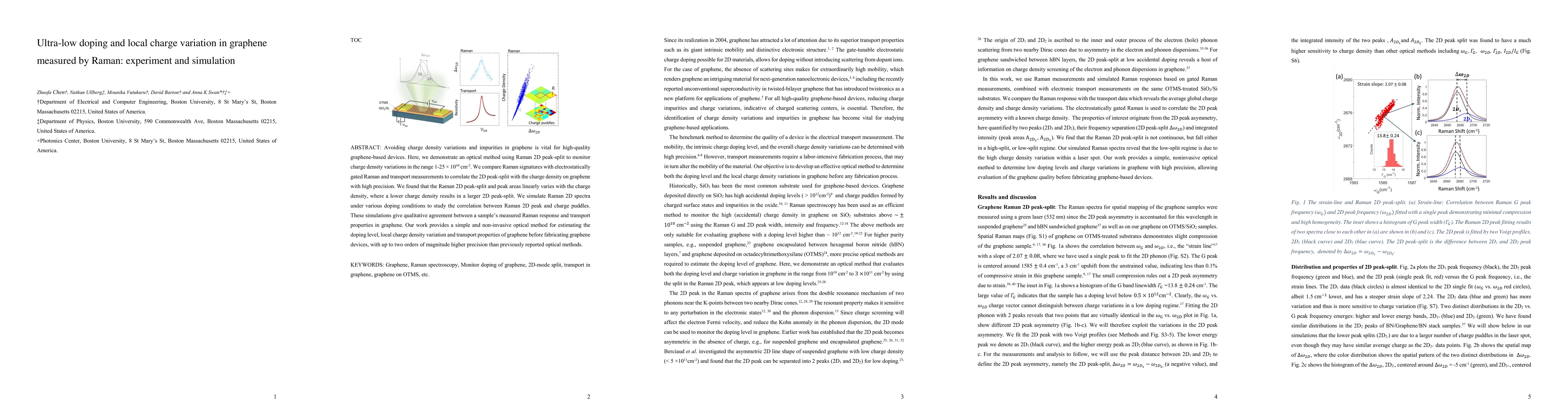 This paper presents an optical method using Raman spectroscopy to measure ultra-low doping and local charge variations in graphene, achieving higher precision than previous methods. The study correlates Raman 2D peak-split with charge density, demonstrating linear variation and providing a non-invasive tool for estimating doping levels and transport properties.